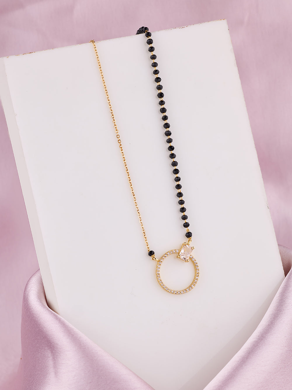 | Shine: | CZ-studded circular pendant with baguette-cut accent |