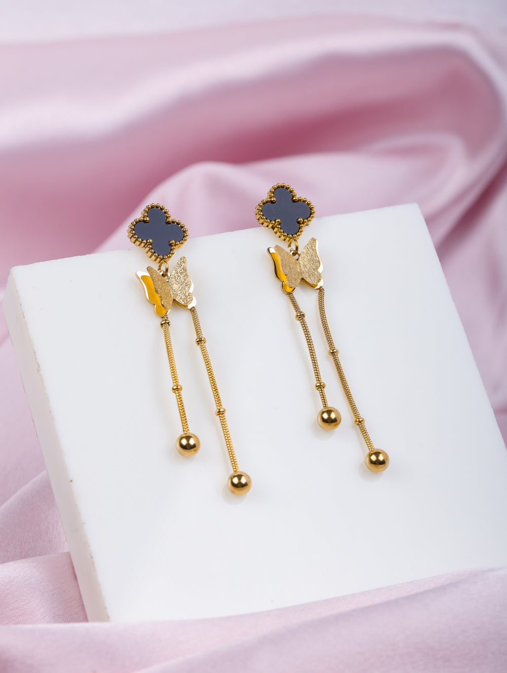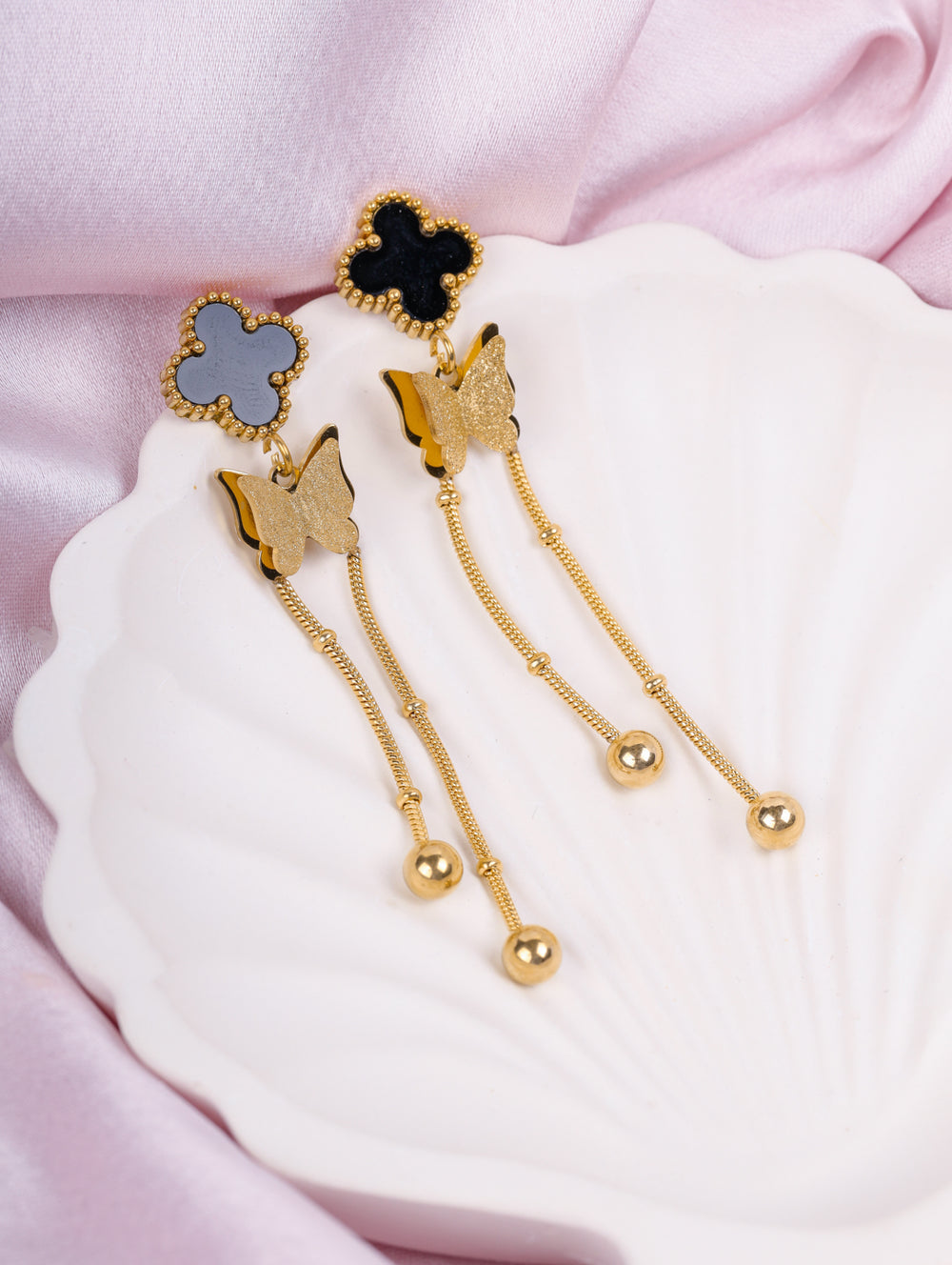 | Specification: | Clover stud framed with beads, butterfly charm, bead chains |