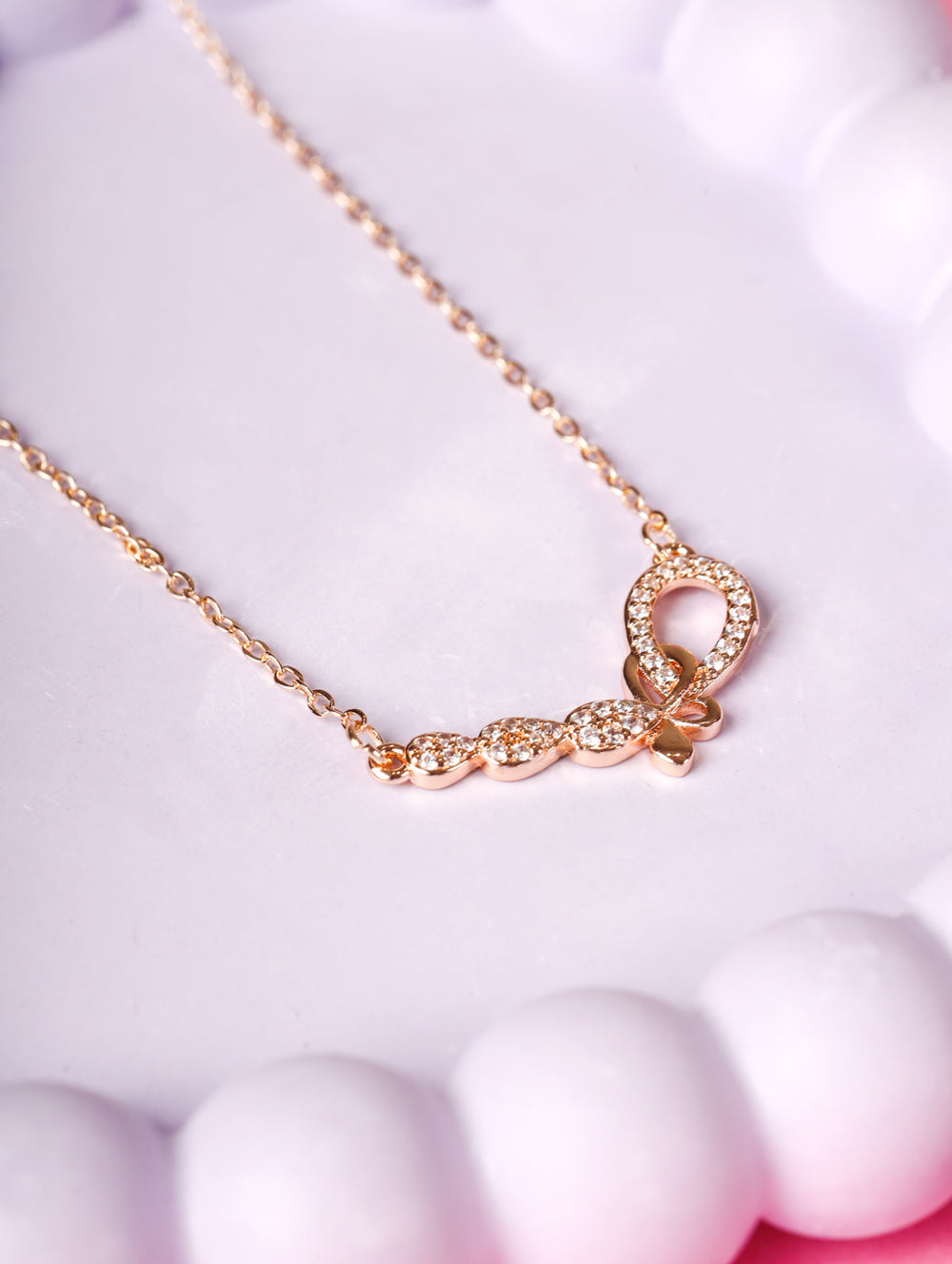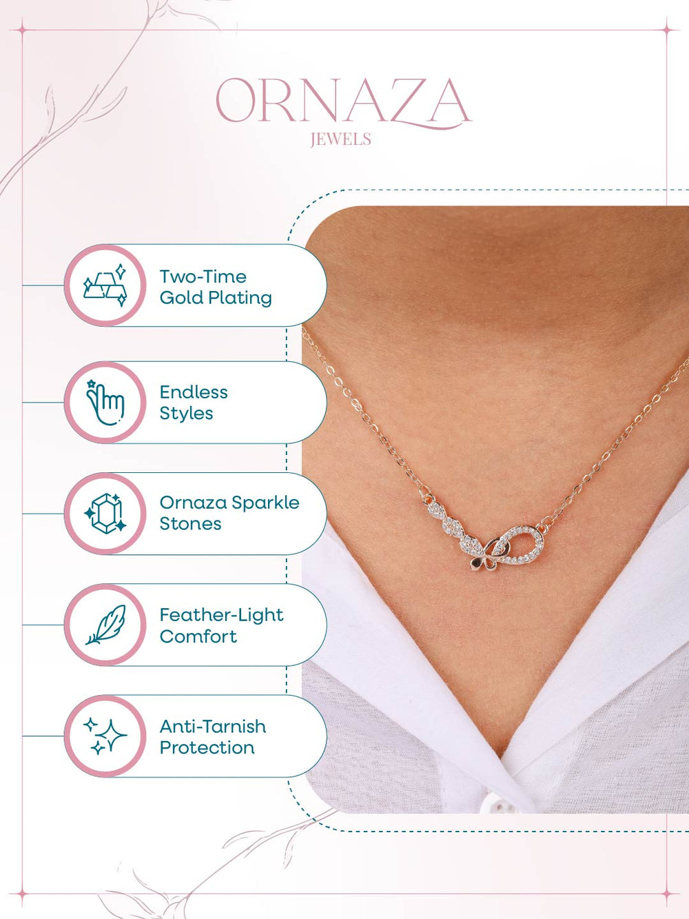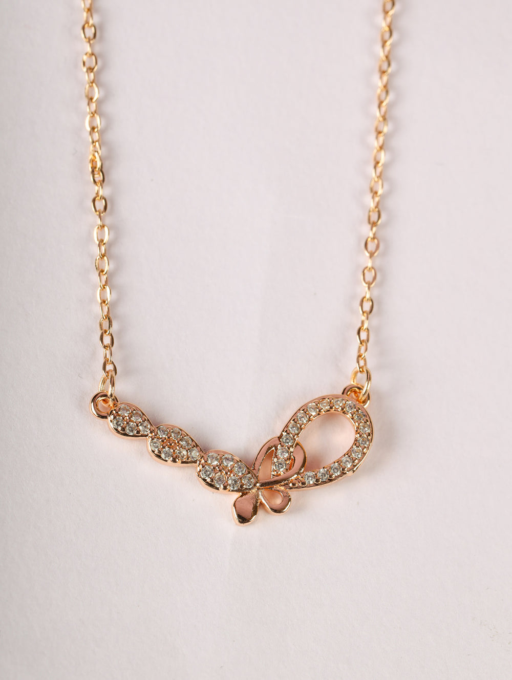 | Pendant: | Infinity loop with butterfly detail, studded with crystals |