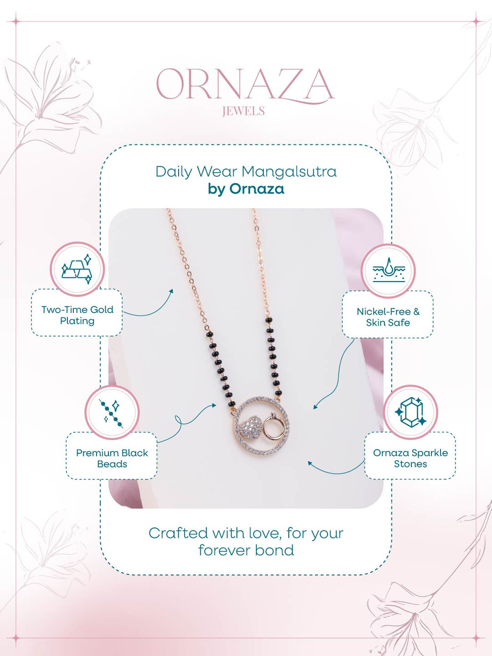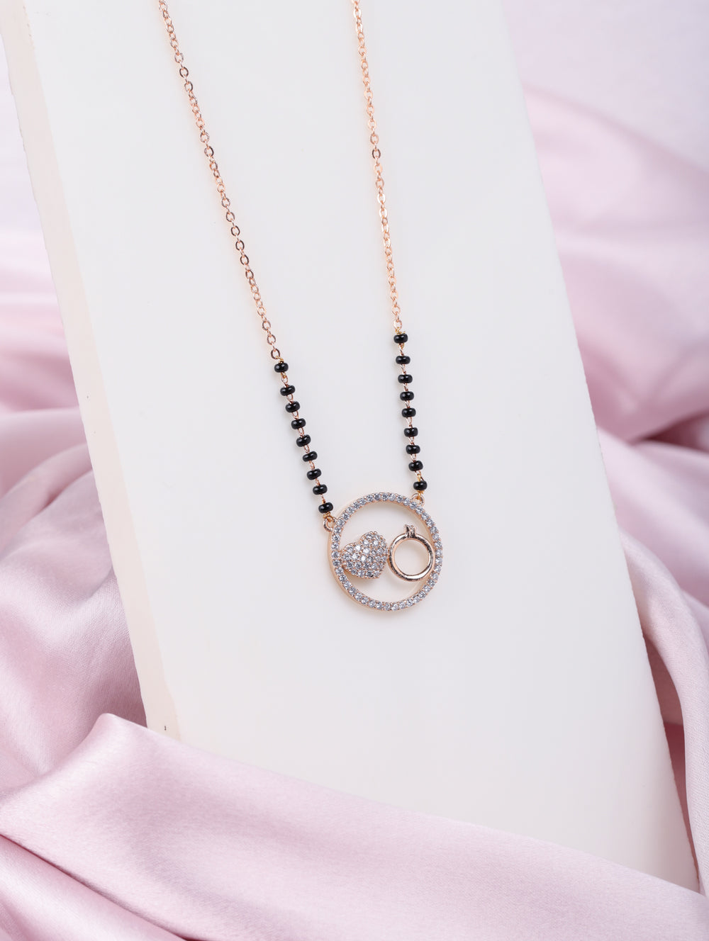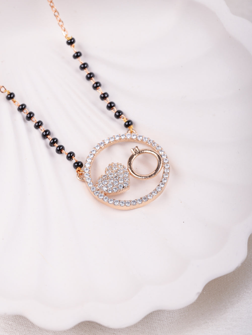 A romantic pendant featuring a sparkling heart ❤️ and solitaire ring 💍 enclosed in a dazzling CZ-studded circle. Crafted in rose-gold plating with black beads, it symbolizes eternal love and commitment ✨.