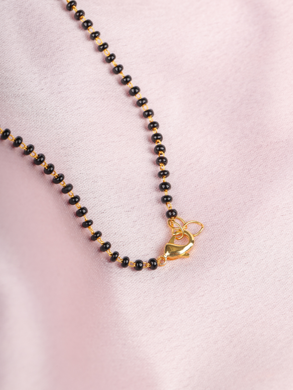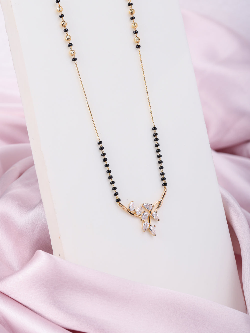 A delicate leafy vine pendant studded with crystal-clear CZ stones ✨, crafted in fine gold plating and paired with classic black beads. Symbolizing growth and elegance, it’s perfect for everyday charm with a traditional touch ❤️.