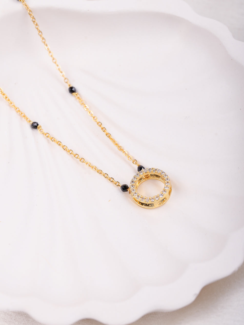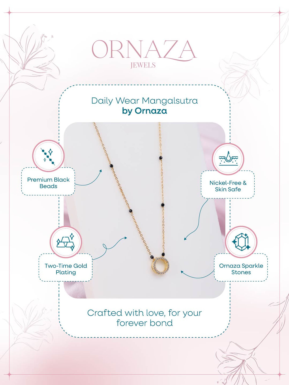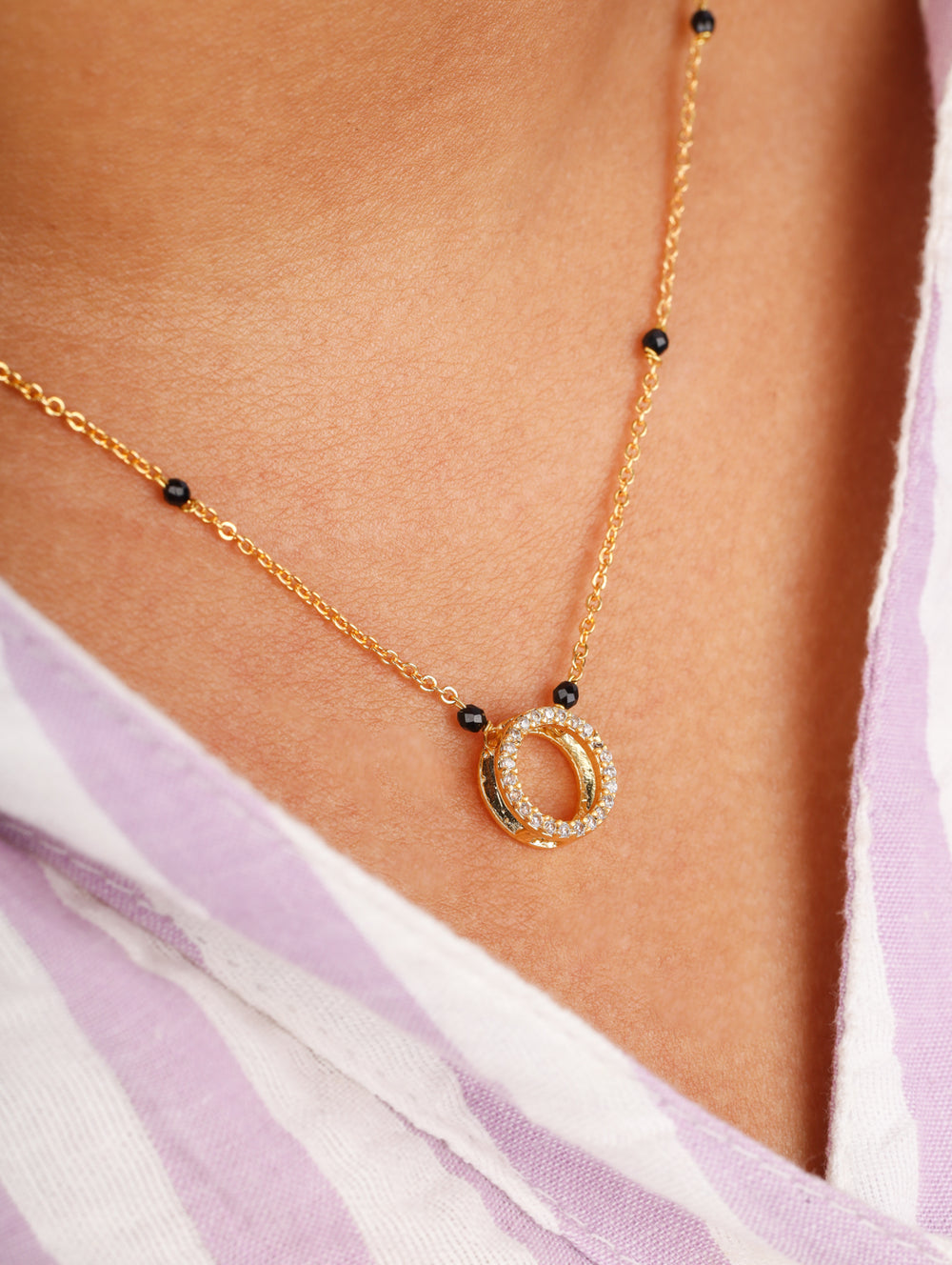 A timeless open-circle pendant crafted with sparkling CZ stones 💎 and gold plating, paired with a delicate black-bead chain. Symbolizing infinity and everlasting love ❤️, this piece is perfect for both daily wear and special occasions.