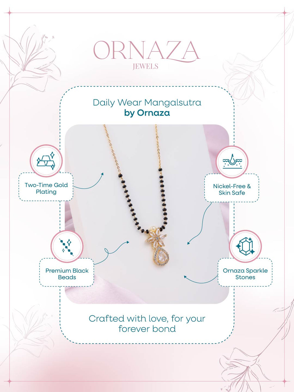 A radiant floral pendant crafted with CZ-studded petals 🌸 and a teardrop drop 💧, finished in fine gold plating with a pearl accent. Paired with a traditional black-bead chain, this piece symbolizes beauty, grace, and everlasting love ❤️.
