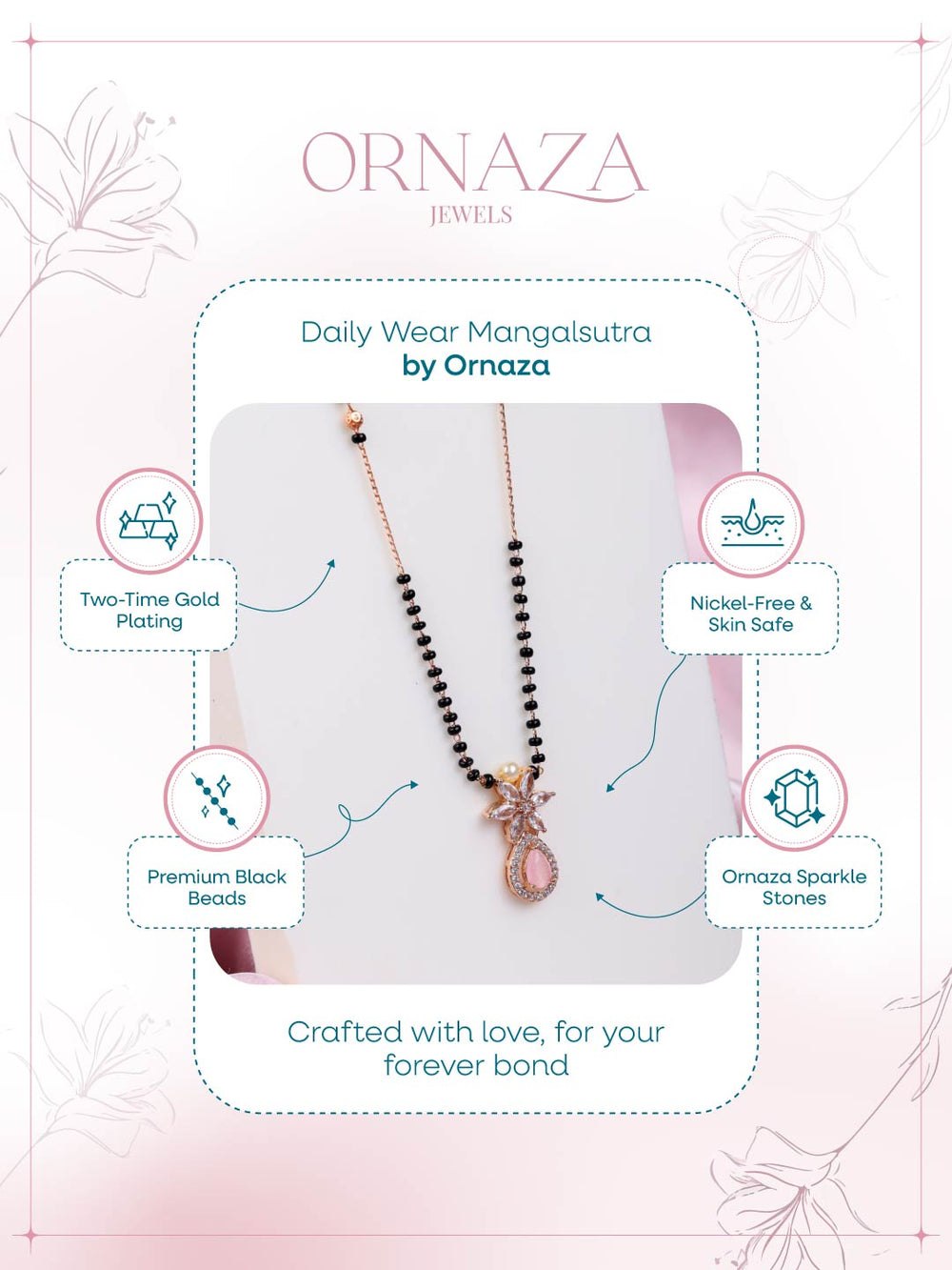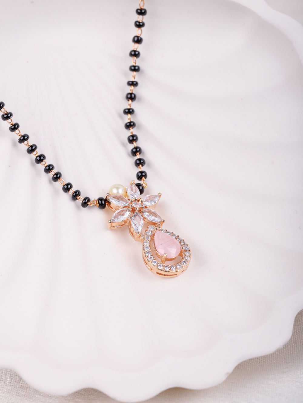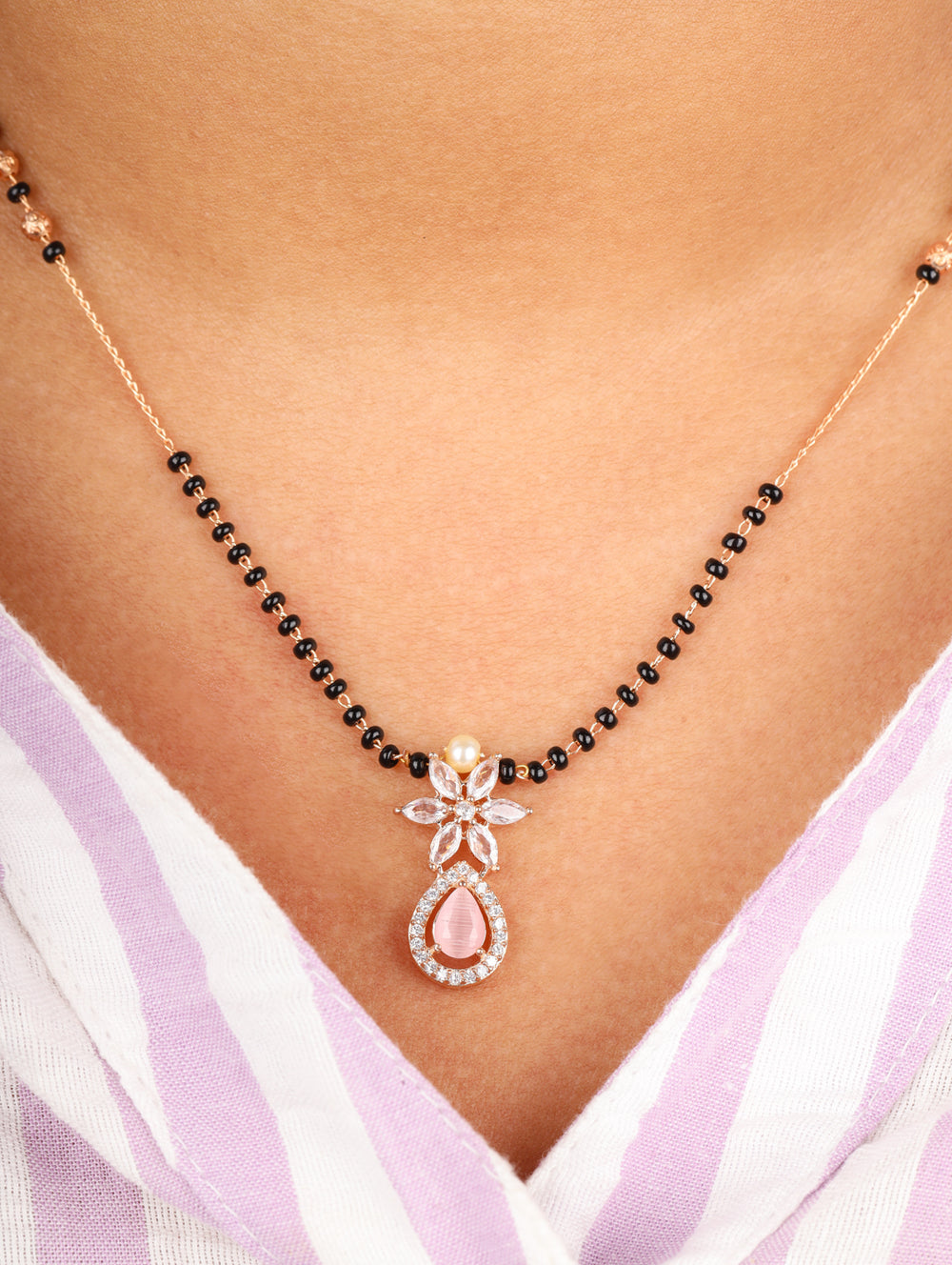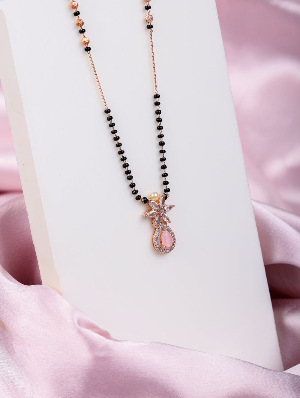 A striking floral pendant with CZ-studded petals 🌸, accented by a luminous pearl and a teardrop drop 💧. Crafted in rose-gold plating with black beads, this design is the perfect mix of grace, elegance, and tradition ❤️.