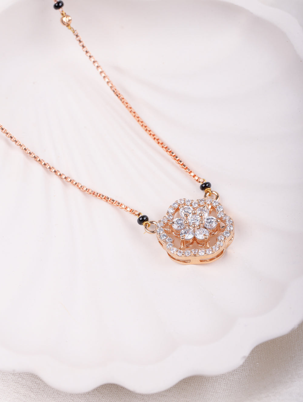 A stunning floral pendant with shimmering CZ stones set in a delicate rose-gold finish ✨. Paired with a sleek black-bead chain, this design beautifully blends elegance and tradition ❤️.