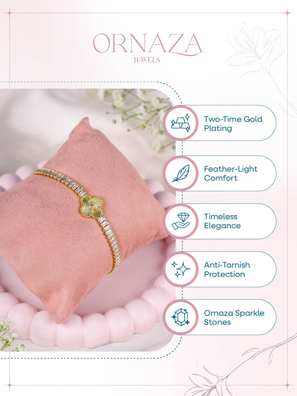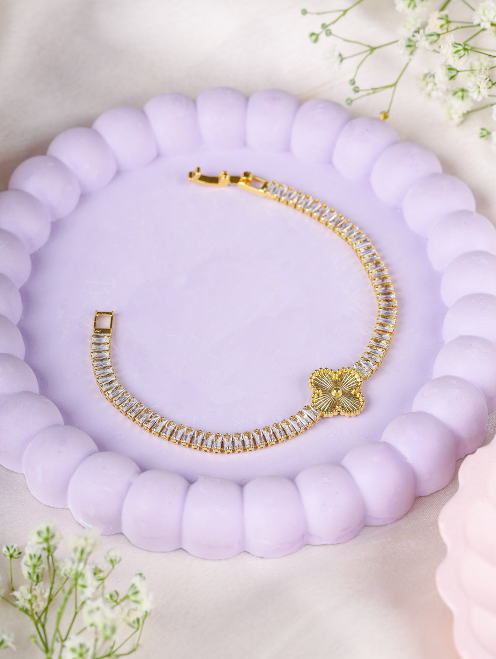 | Specification: | Premium plating, baguette-cut stones, floral centerpiece |