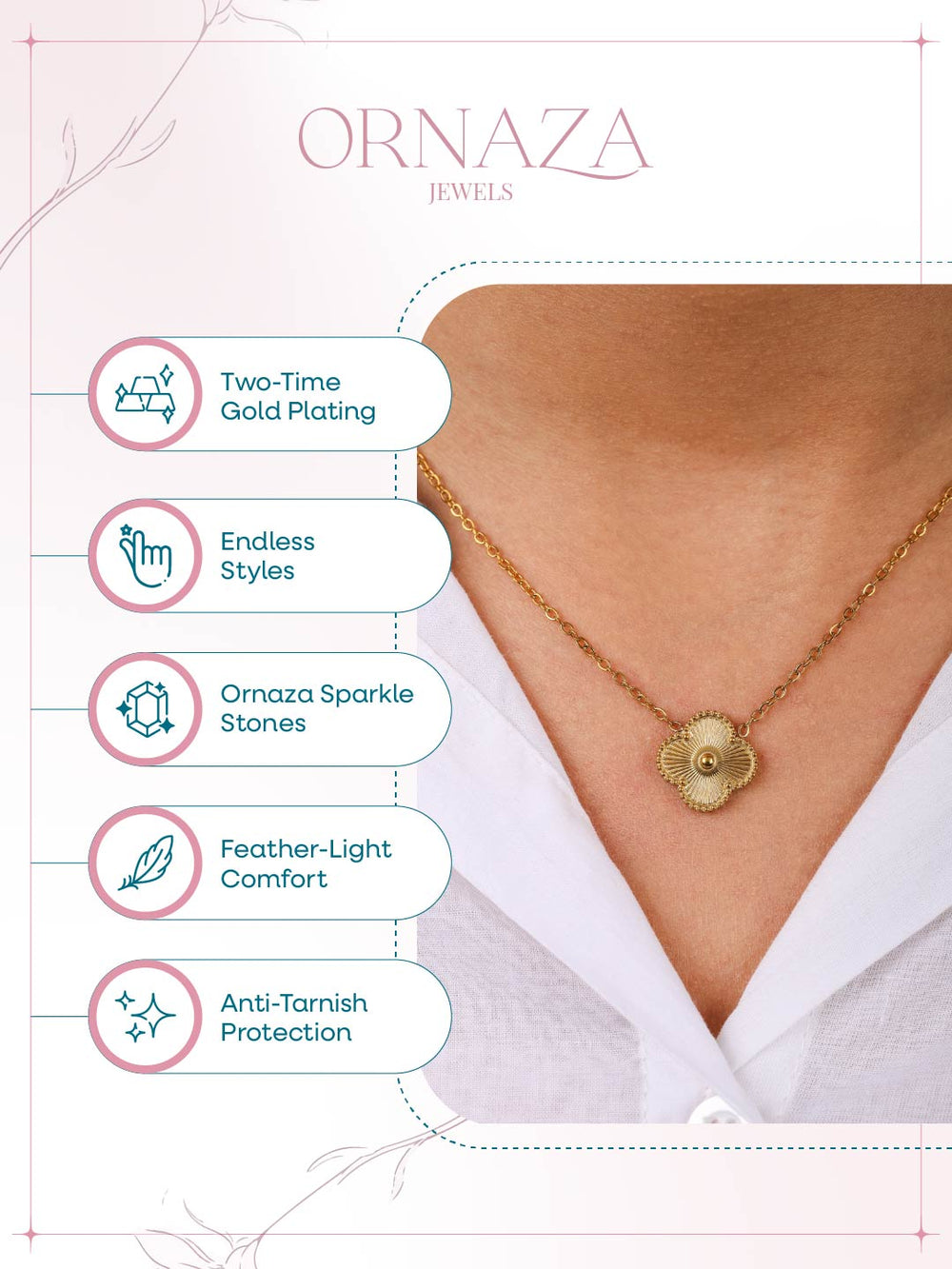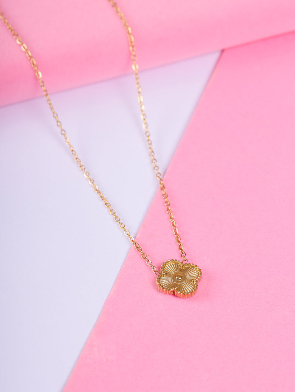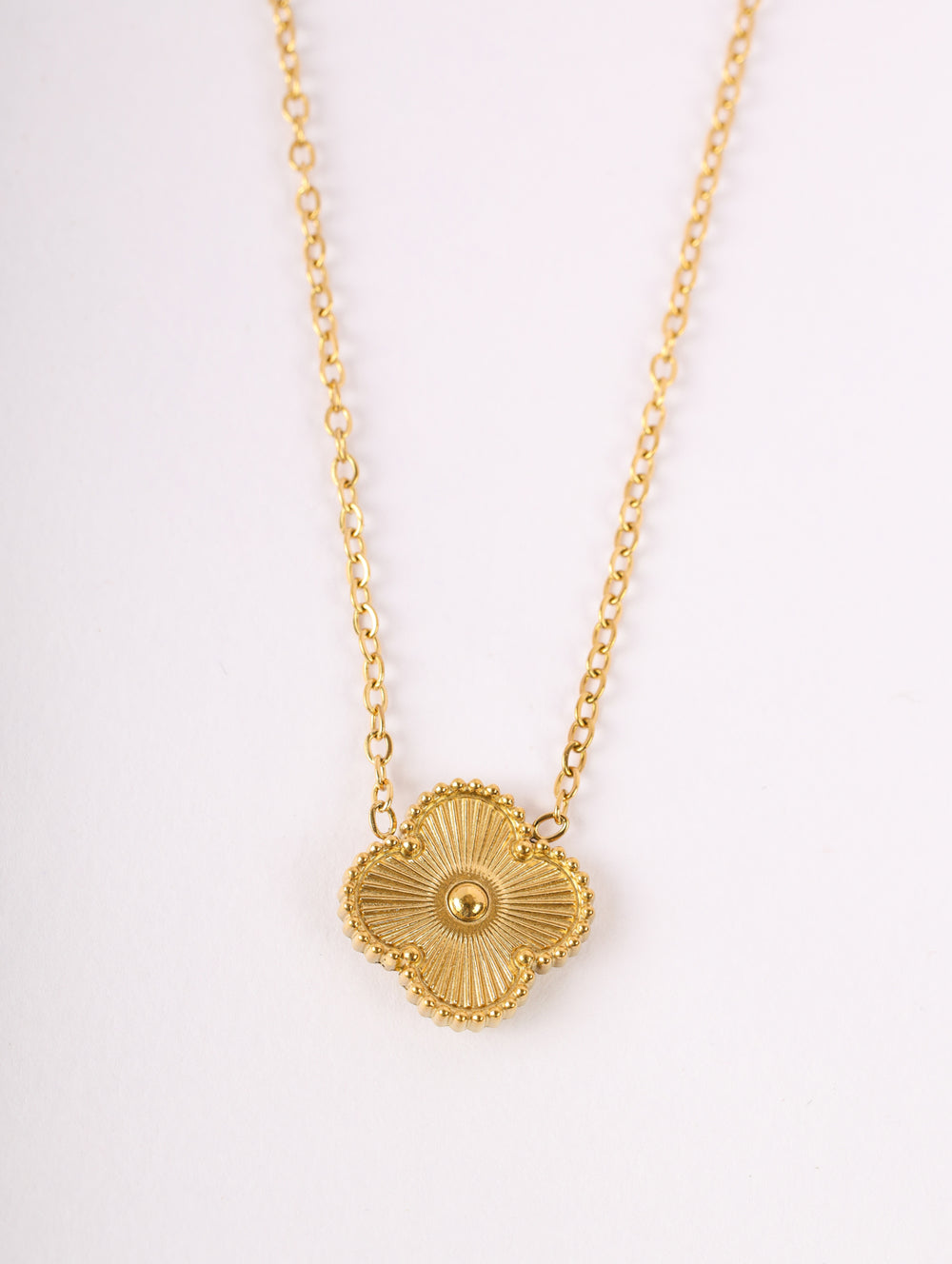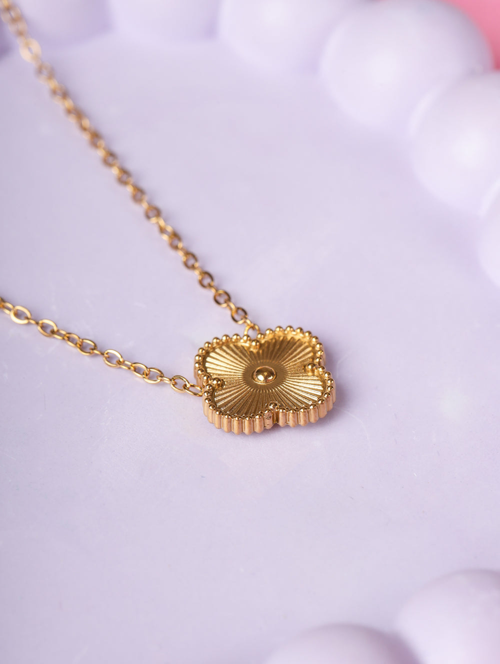 | Pendant: | Textured clover-flower design with central golden bead |