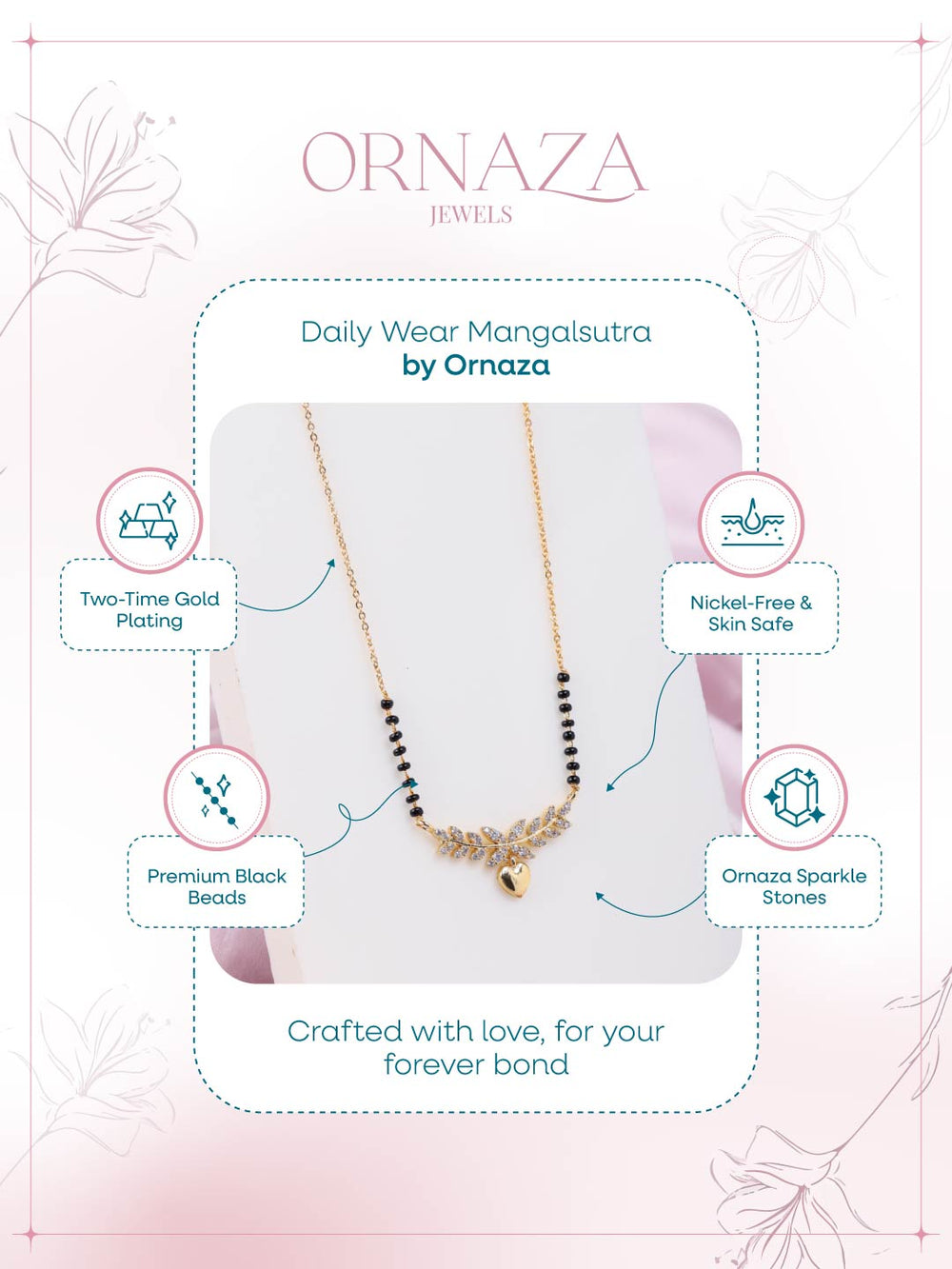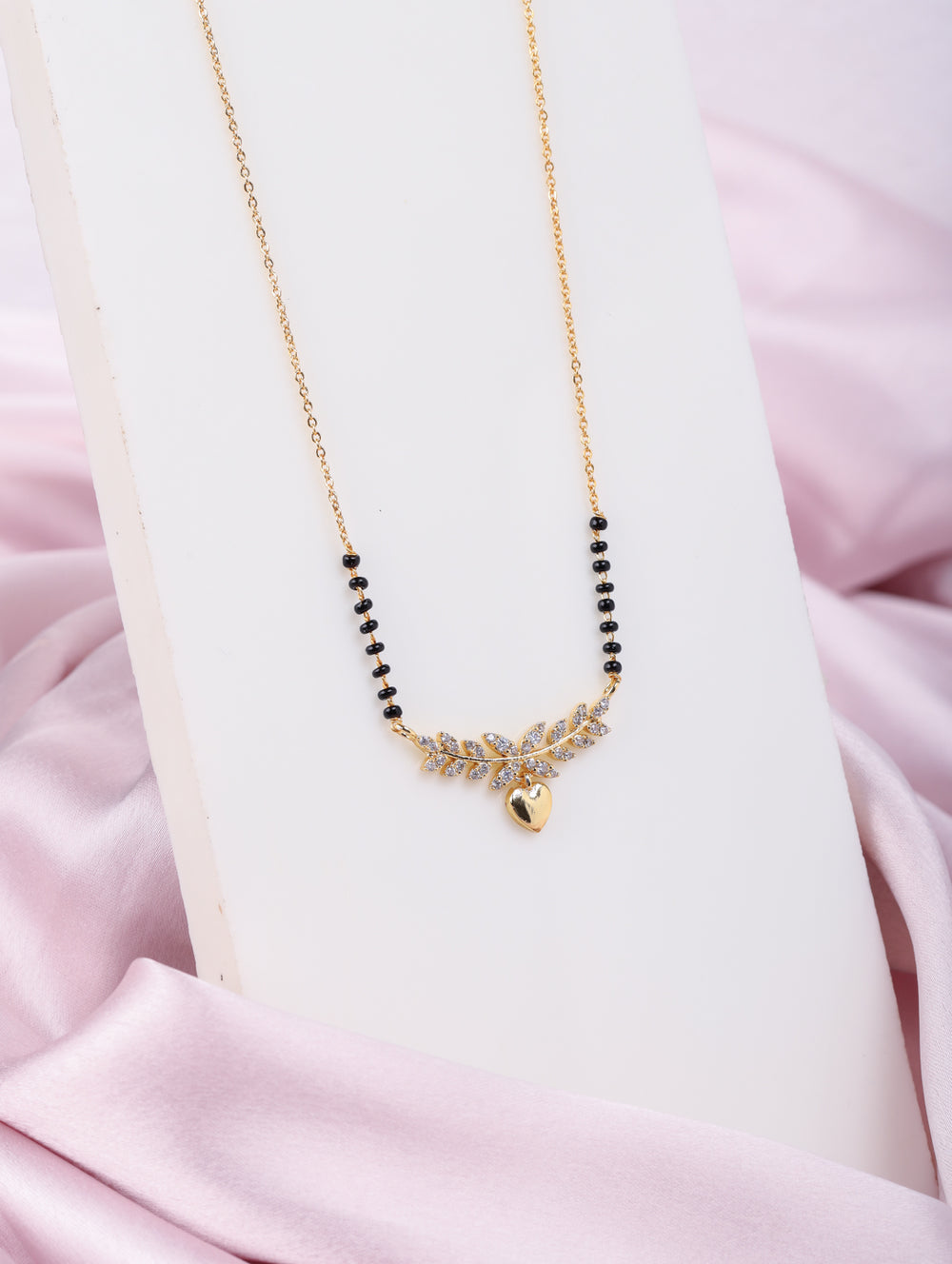 A charming leaf-inspired pendant with CZ-studded branches 🍃, gracefully holding a golden heart 💛. Crafted in fine gold plating with black beads, this design symbolizes love, warmth, and tradition blended with modern elegance ✨.