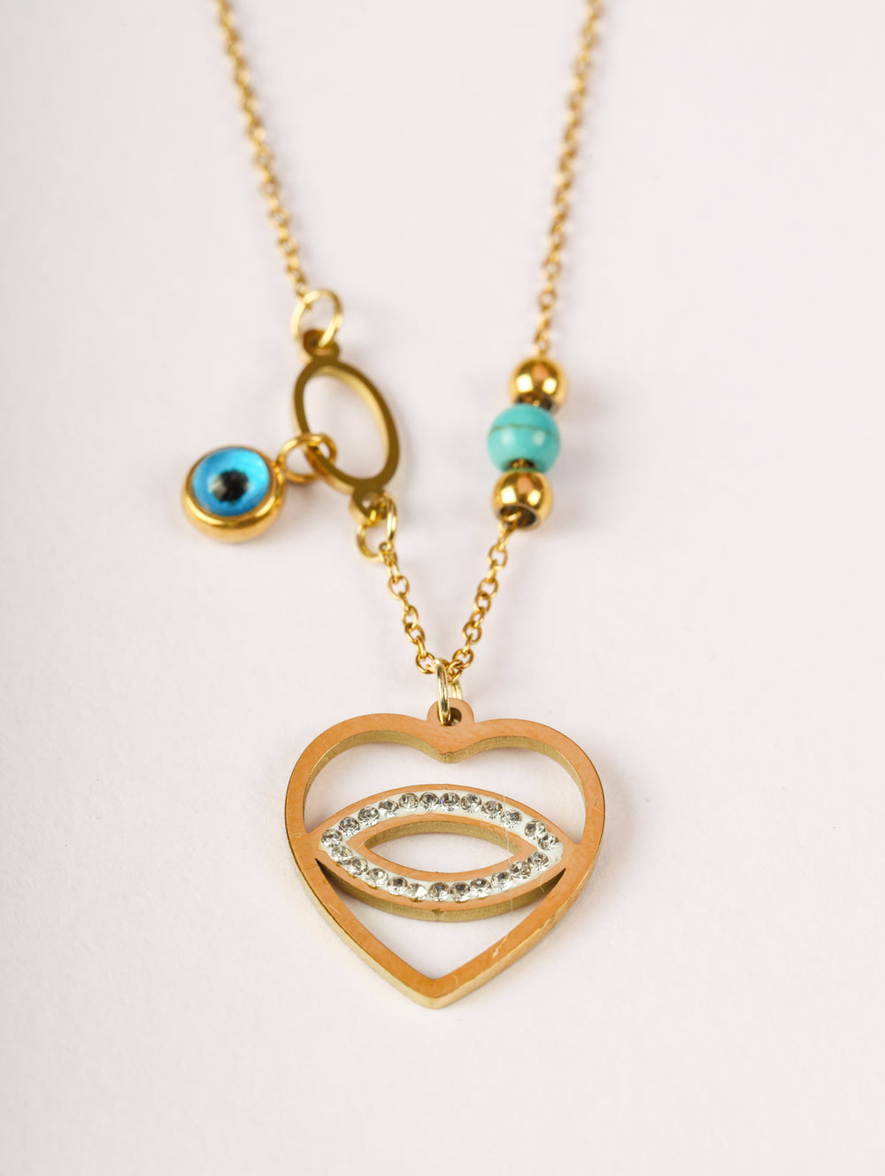 | Pendant: | Heart outline with crystal-studded evil eye |