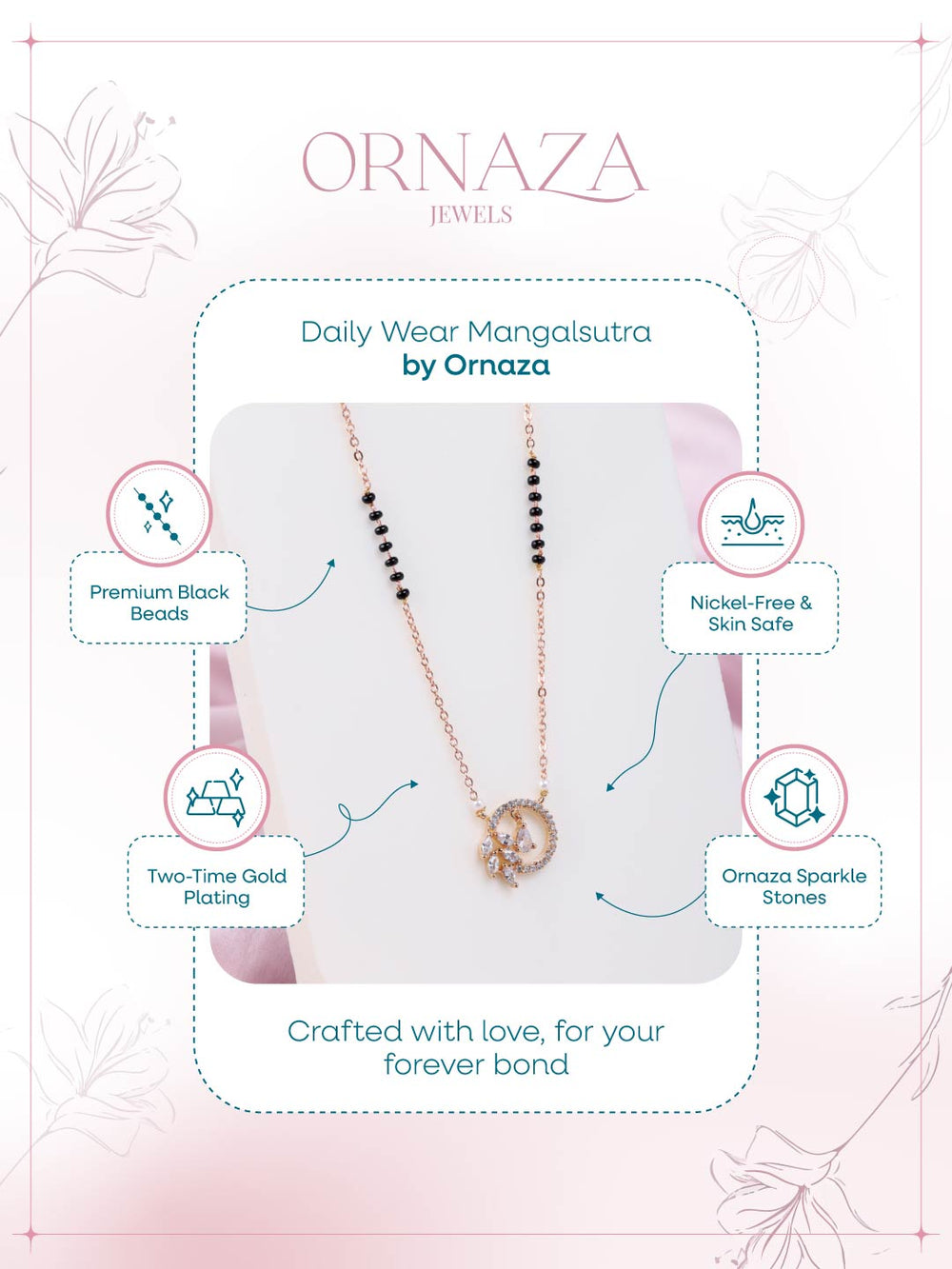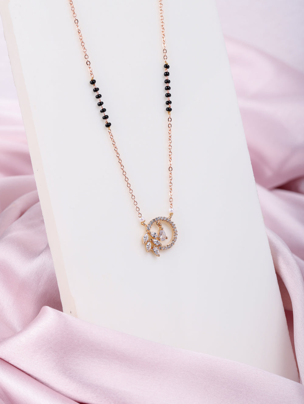 A chic circular pendant with CZ-studded leaf motifs 🍃 and a dangling teardrop 💎 at the center. Crafted in rose-gold plating with black beads, this design blends freshness and elegance, perfect for both daily wear and festive occasions ❤️.