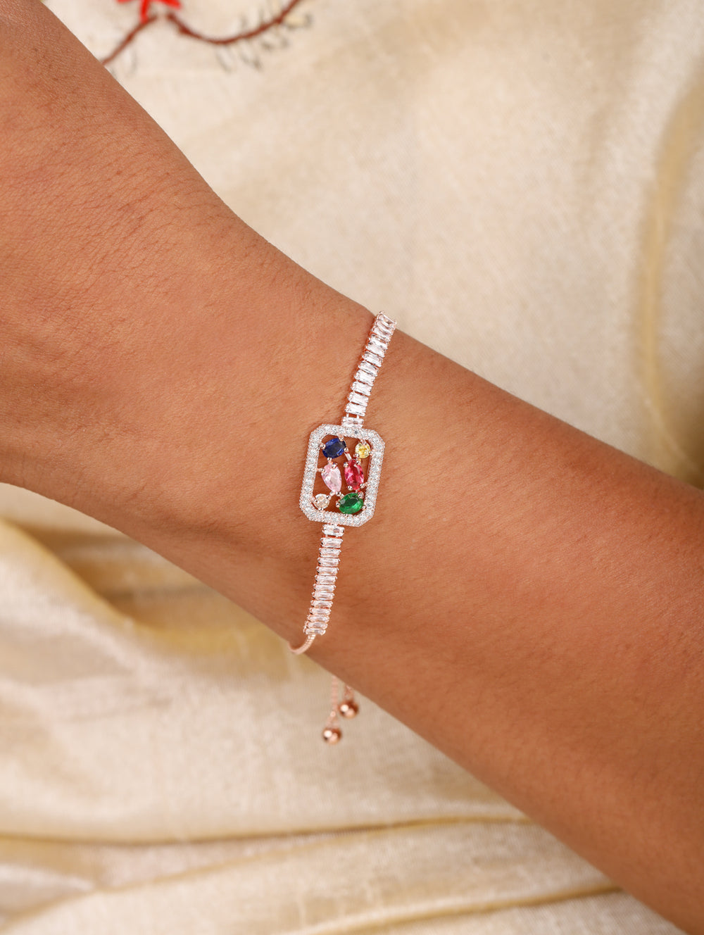 | Color: | Rose-gold plated with multicolor gemstones |