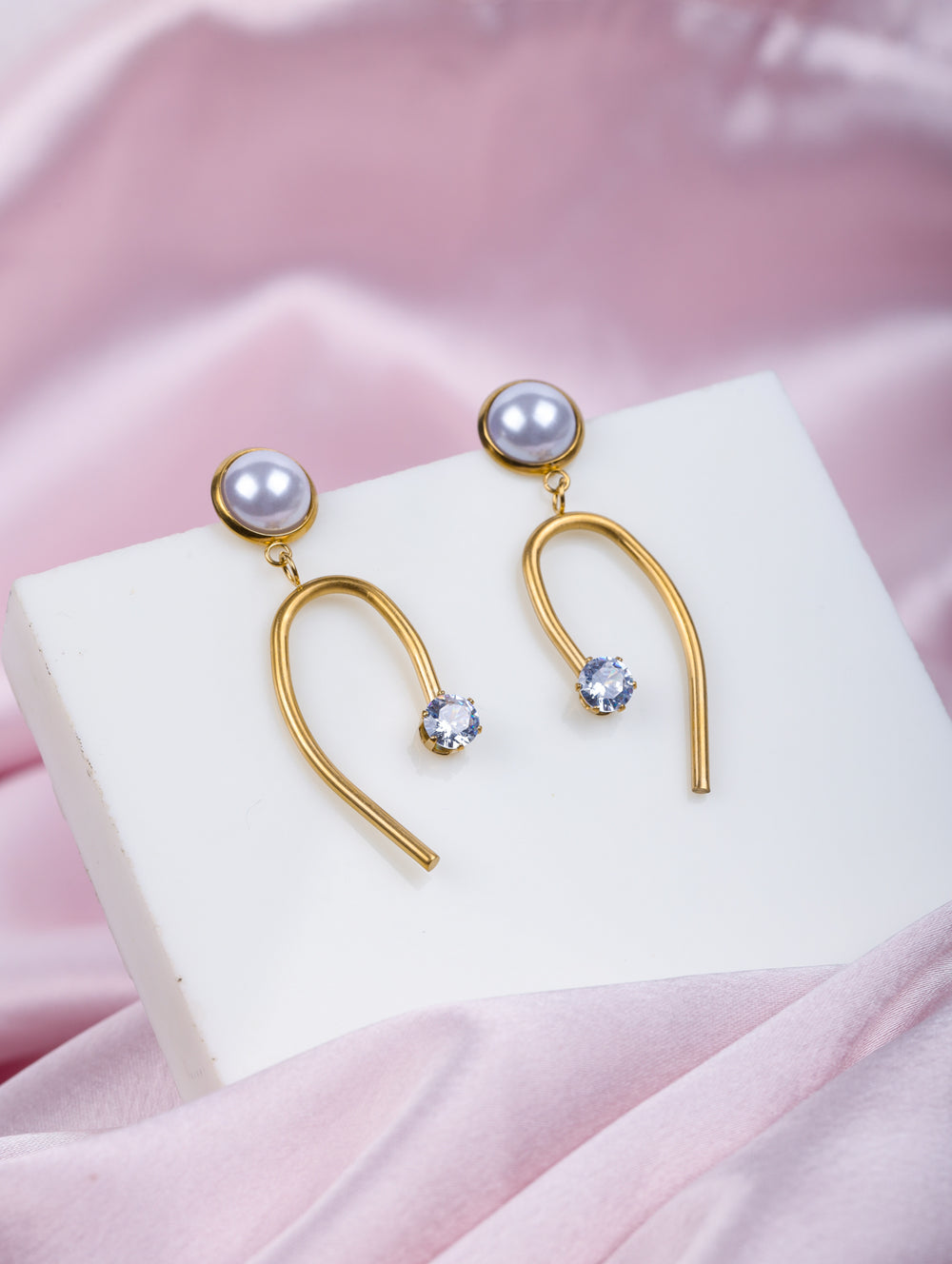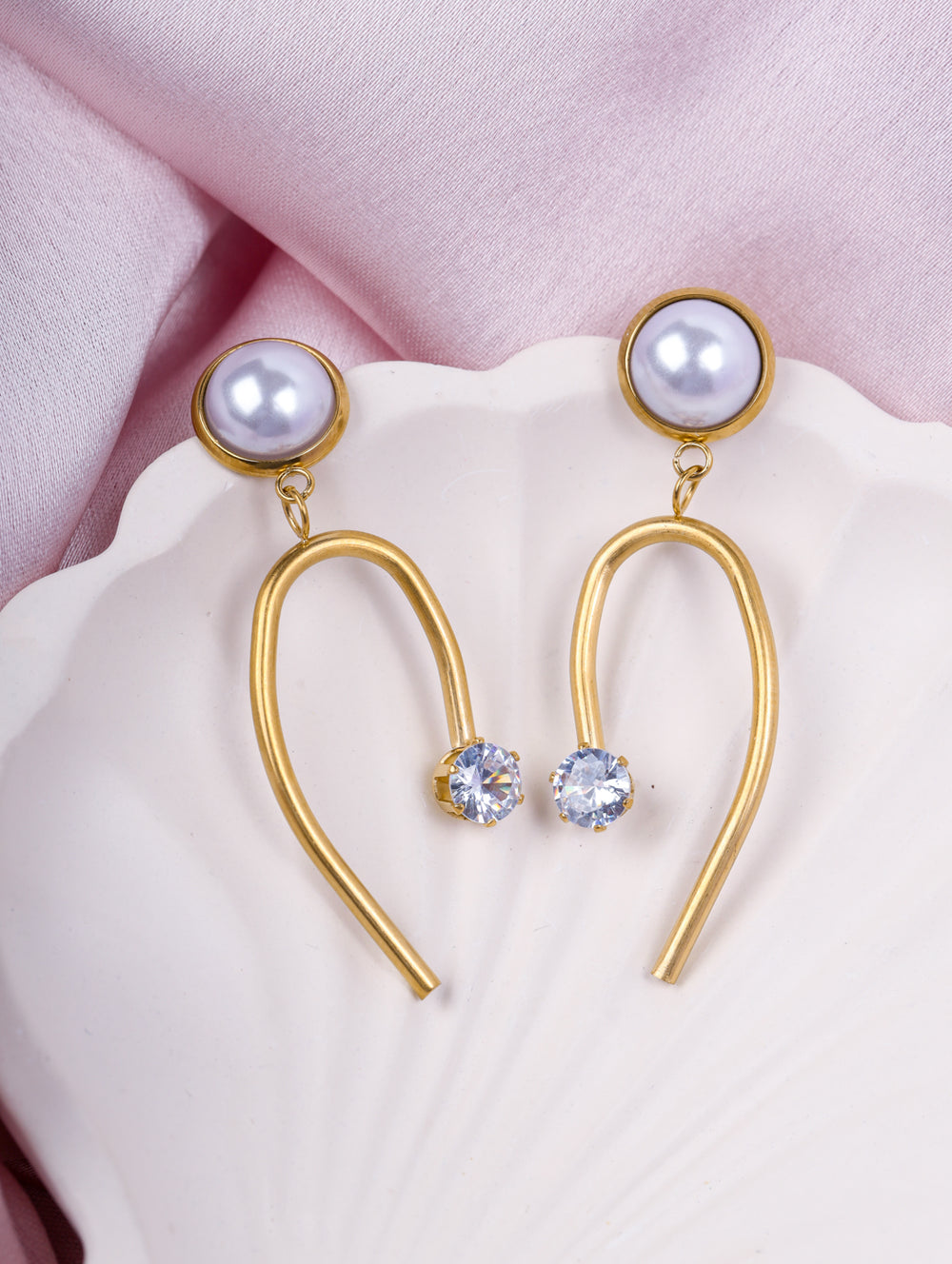 | Specification: | Pearl stud base with dangling gold curve & CZ stone |