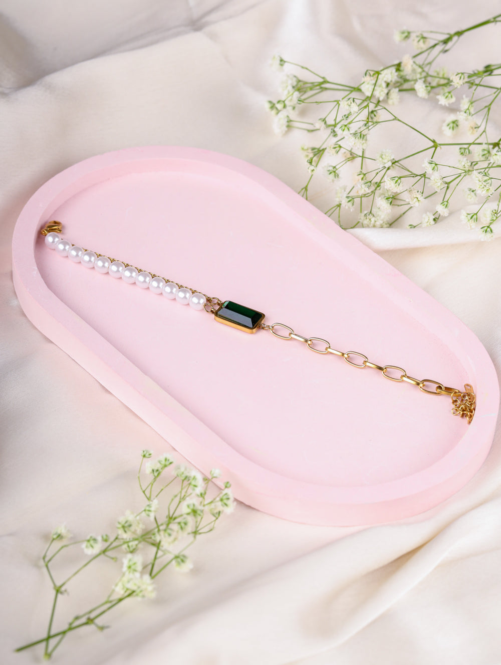 | Design: | Half pearl strand with rectangular emerald green charm |