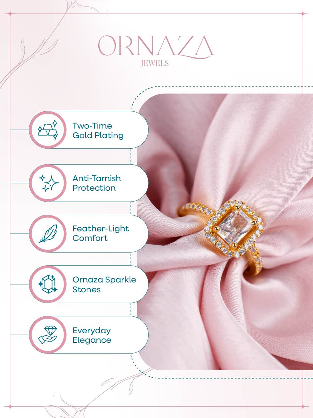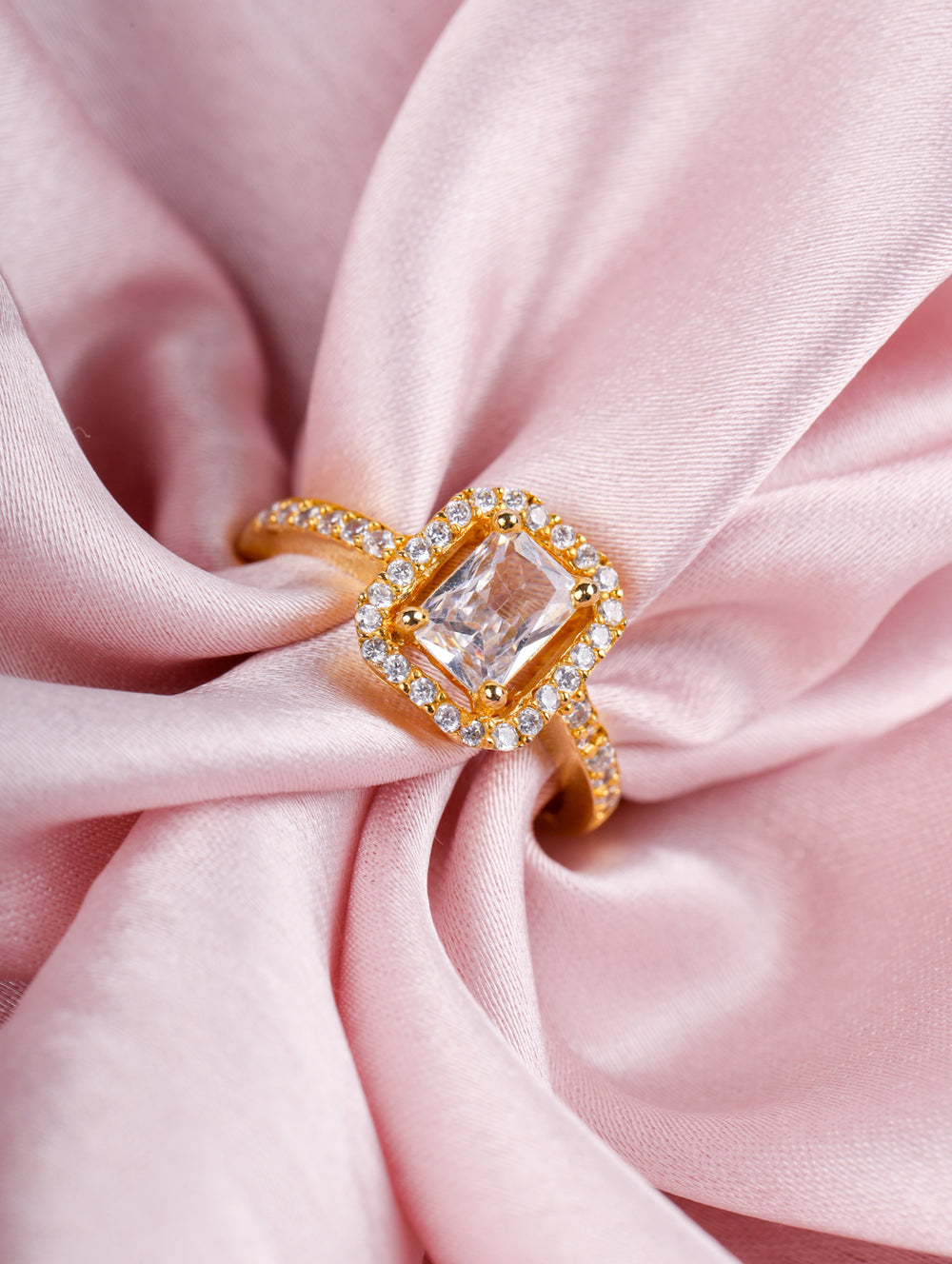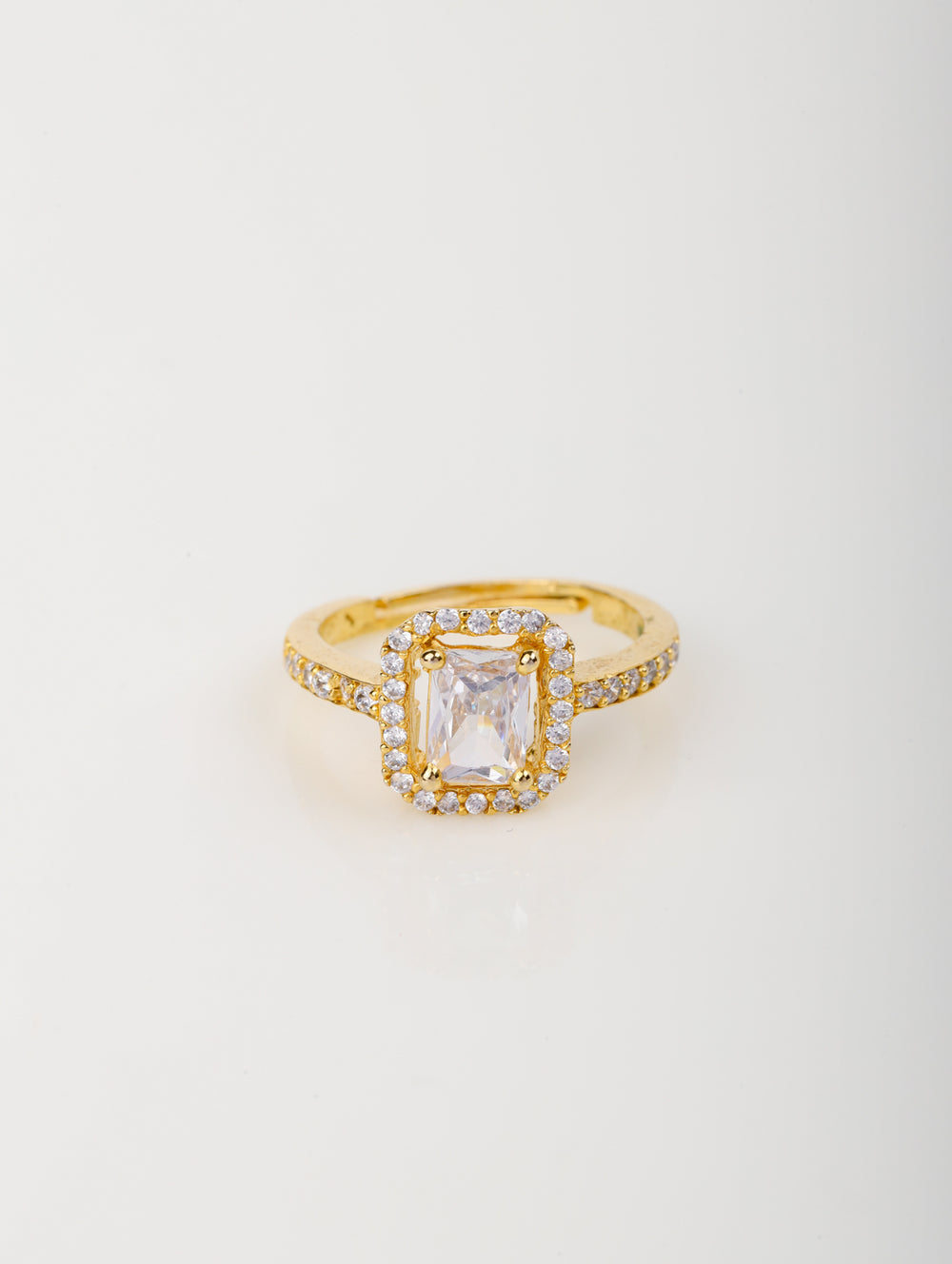 | Specification: | Rectangular-cut CZ stone with halo design |