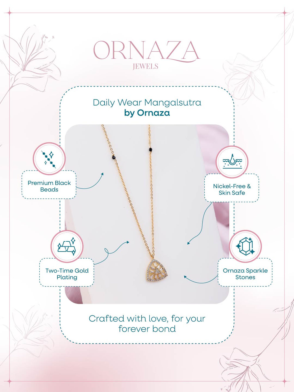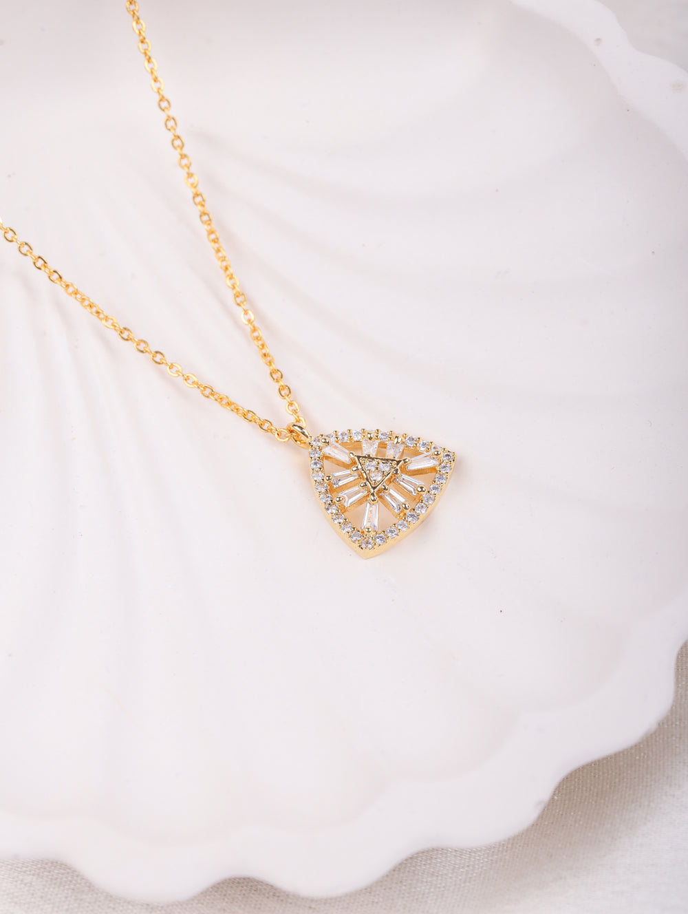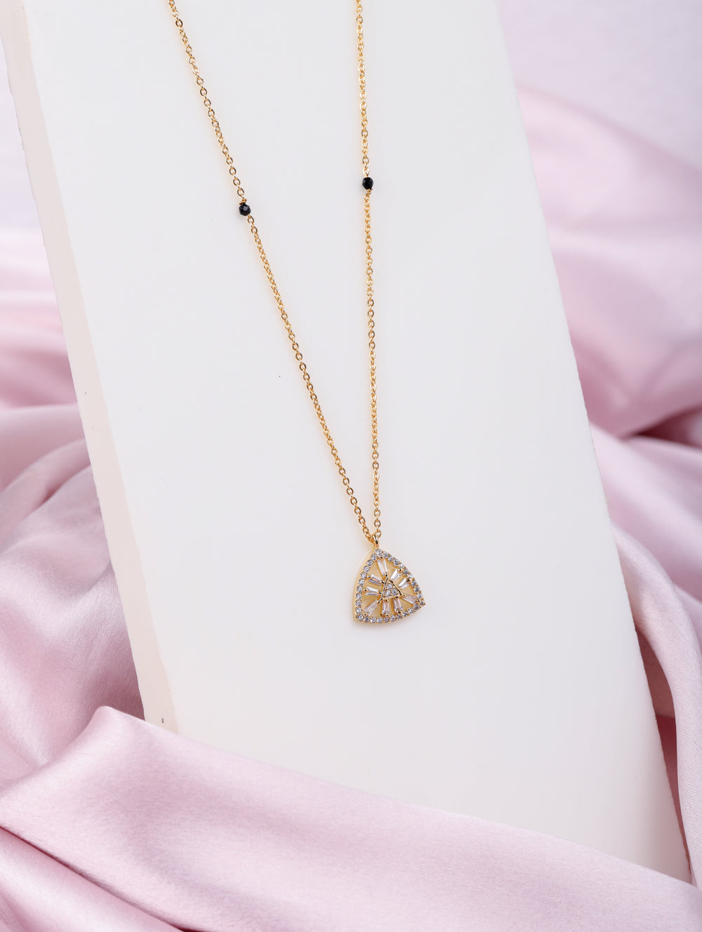 A bold triangular pendant studded with dazzling CZ stones 💎, symbolizing strength and harmony. Crafted in fine gold plating with a sleek chain, this design brings a modern twist to traditional elegance ❤️.