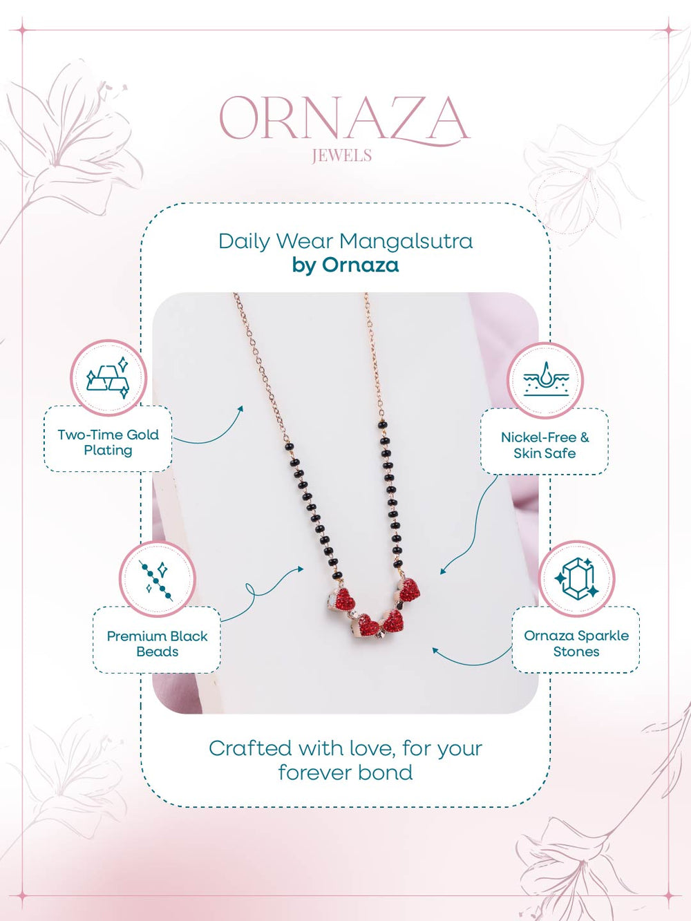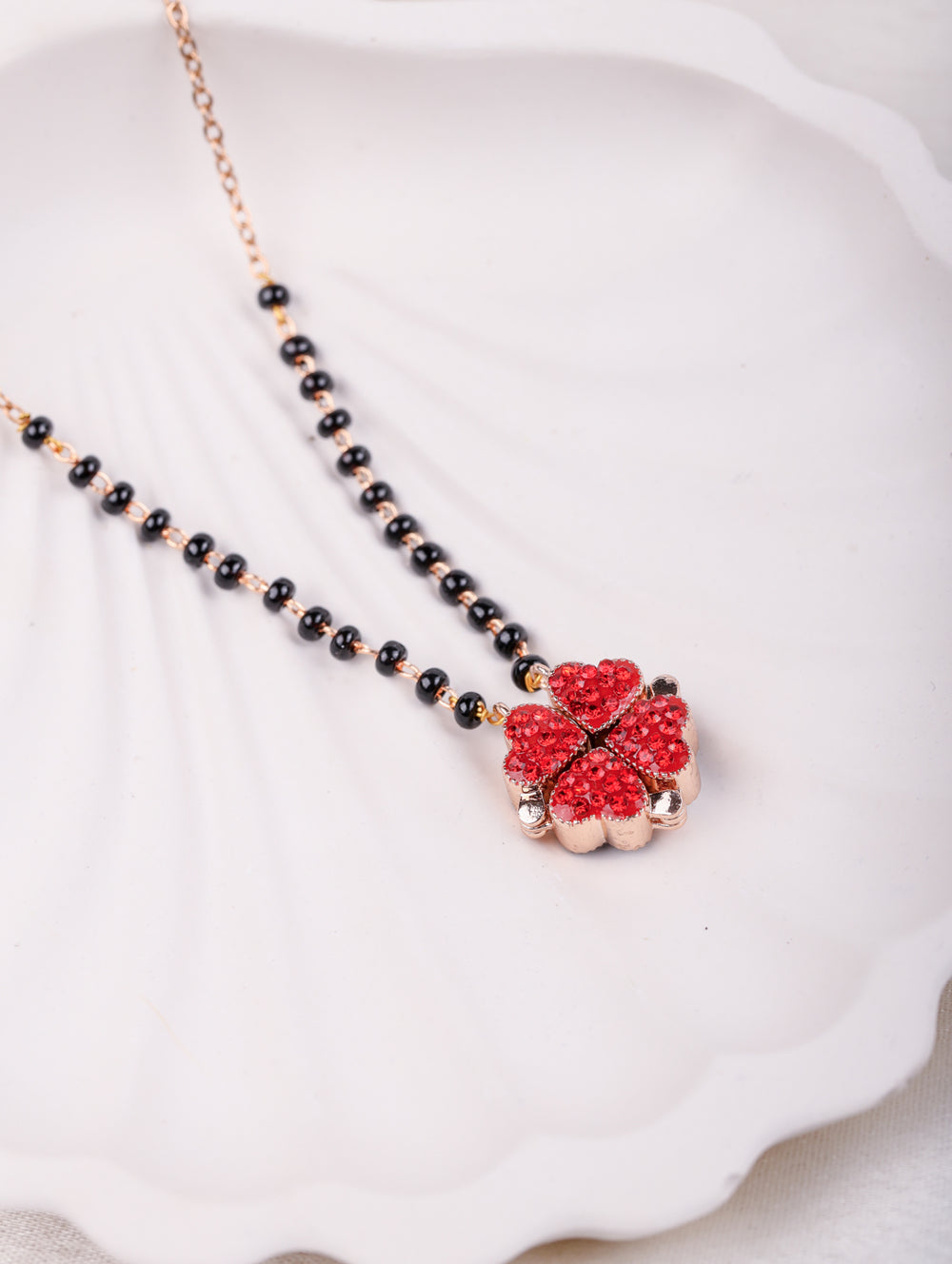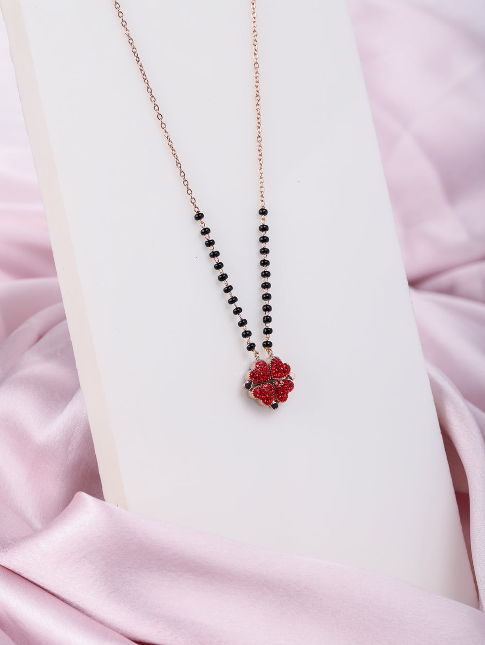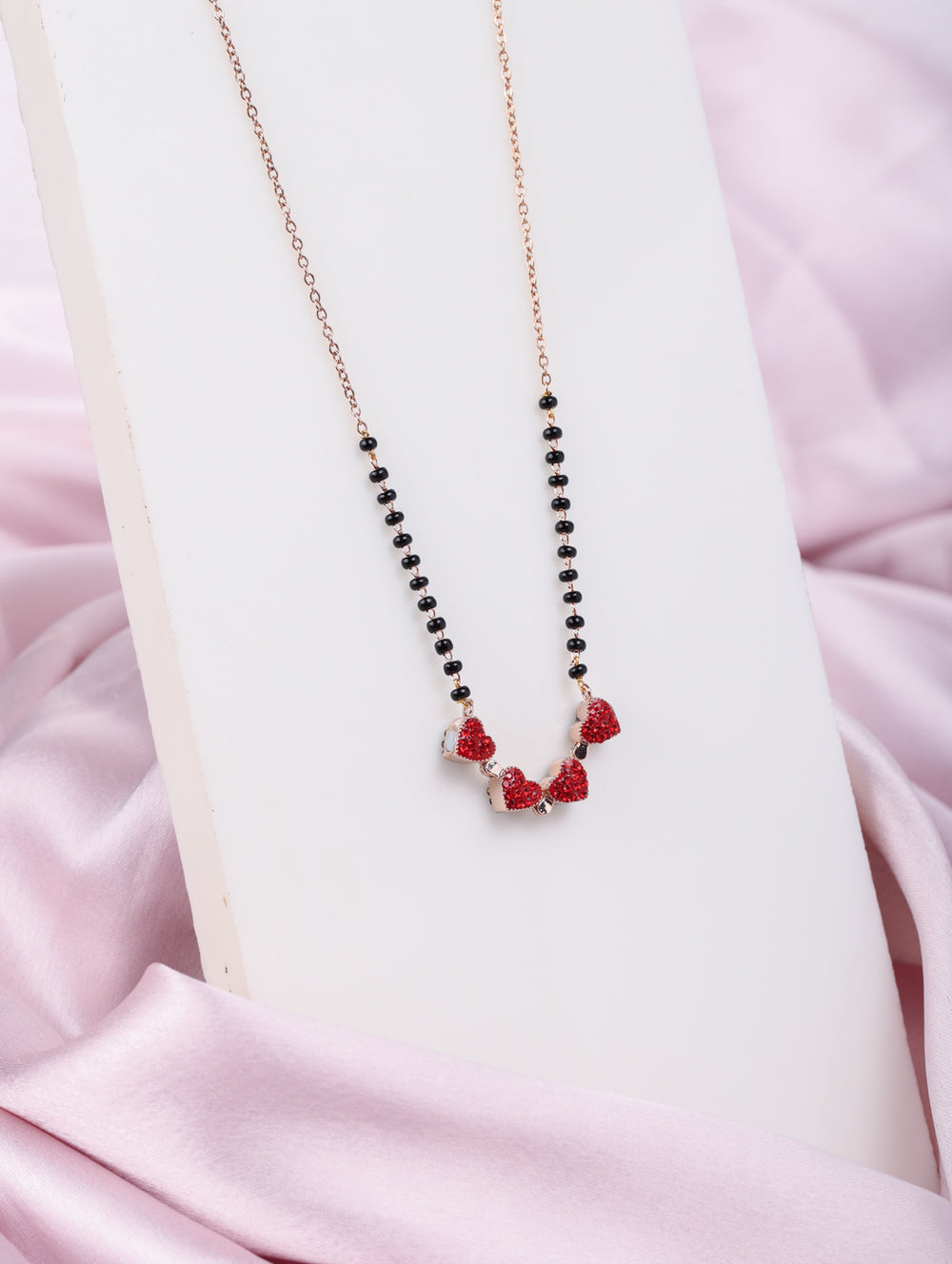 A bold and romantic design featuring four radiant red hearts ❤️ arranged in a floral-inspired cluster. Crafted with rose-gold plating and paired with a black-bead chain, this mangalsutra symbolizes love, passion, and togetherness 💎.