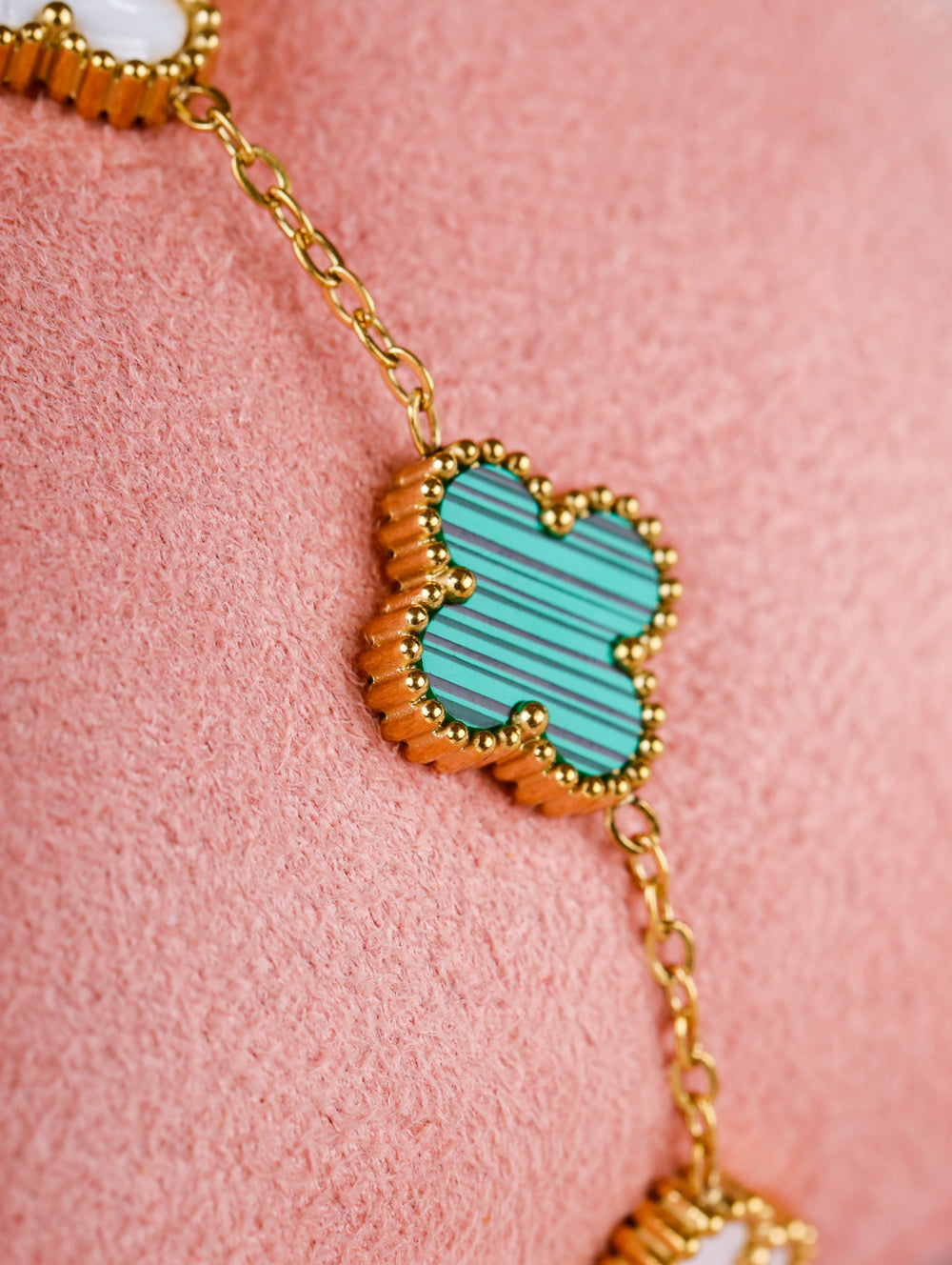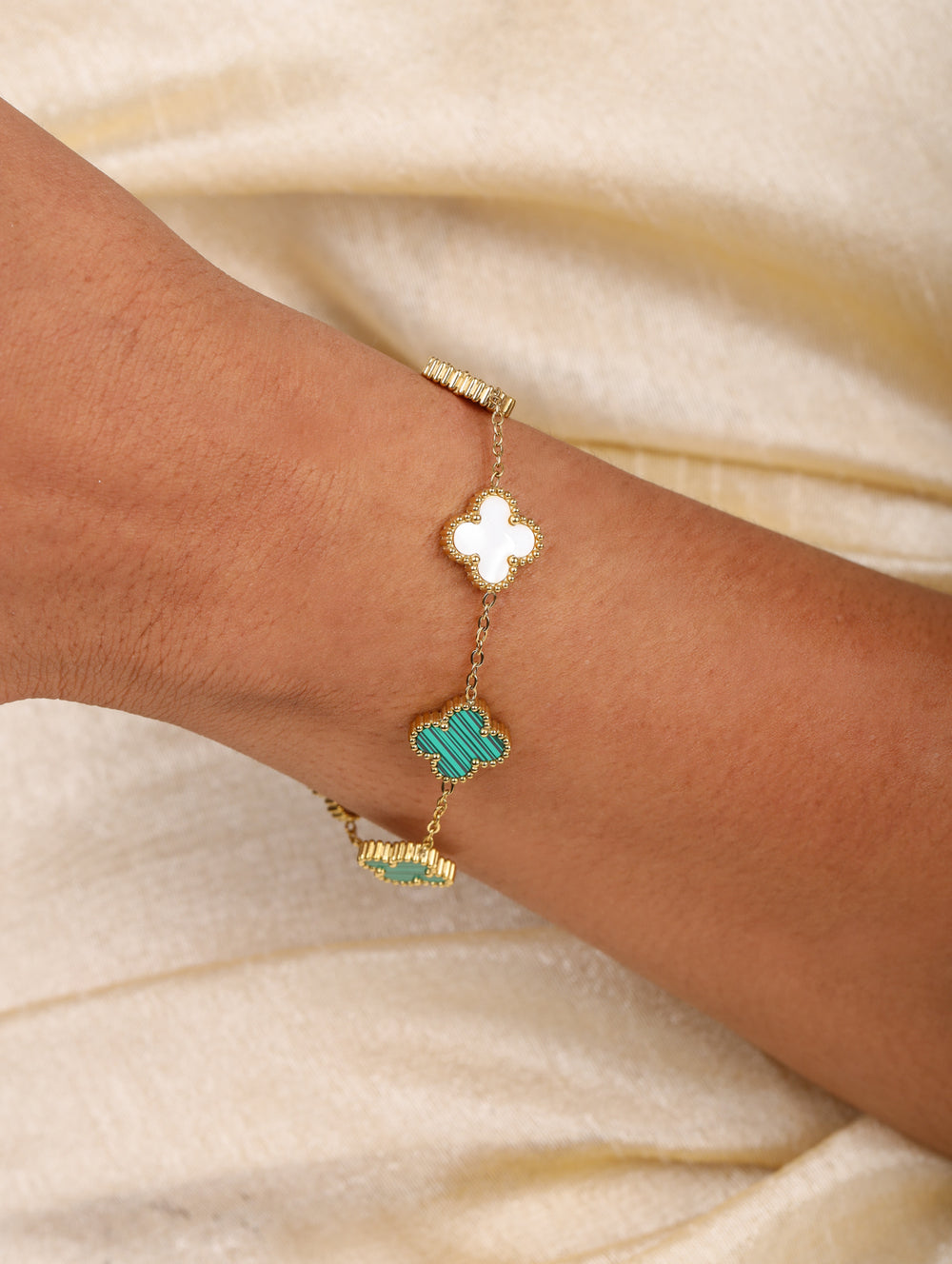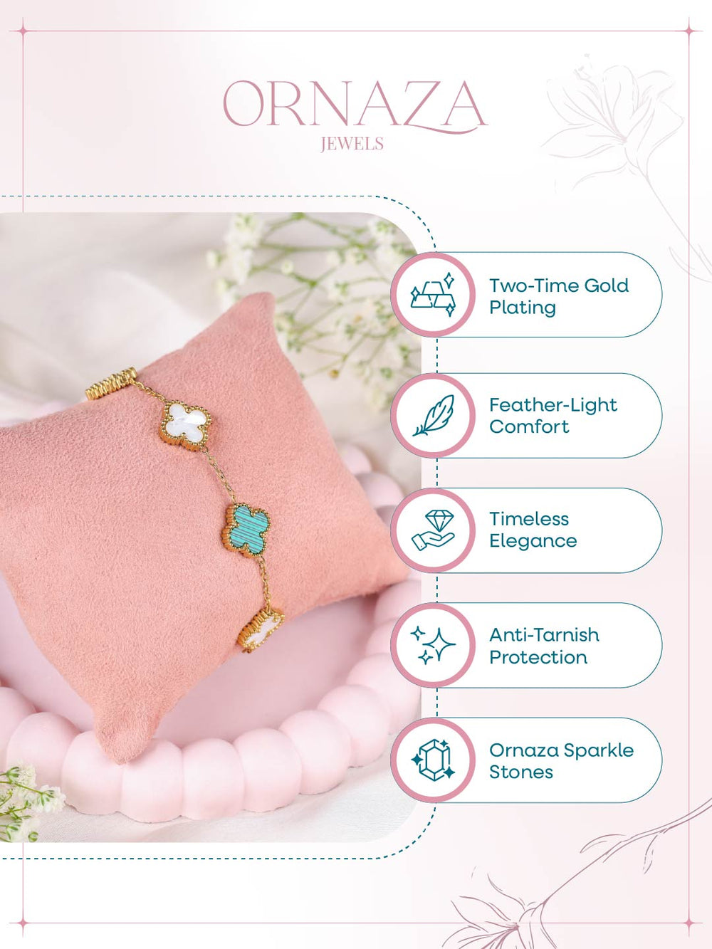 | Color: | Gold-plated with reversible clover charms (Pearl White & Turquoise Stripes) |