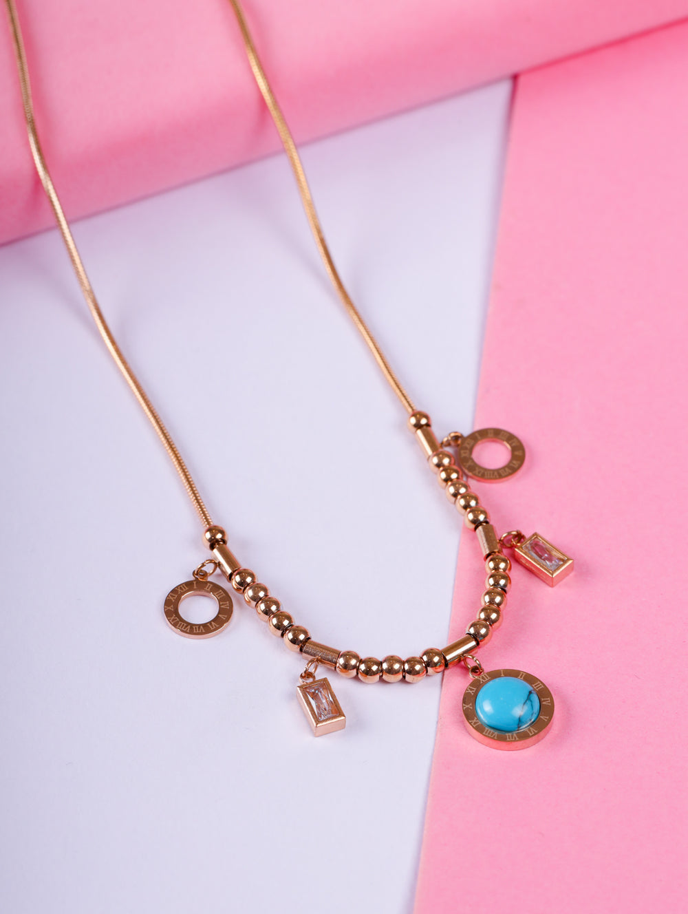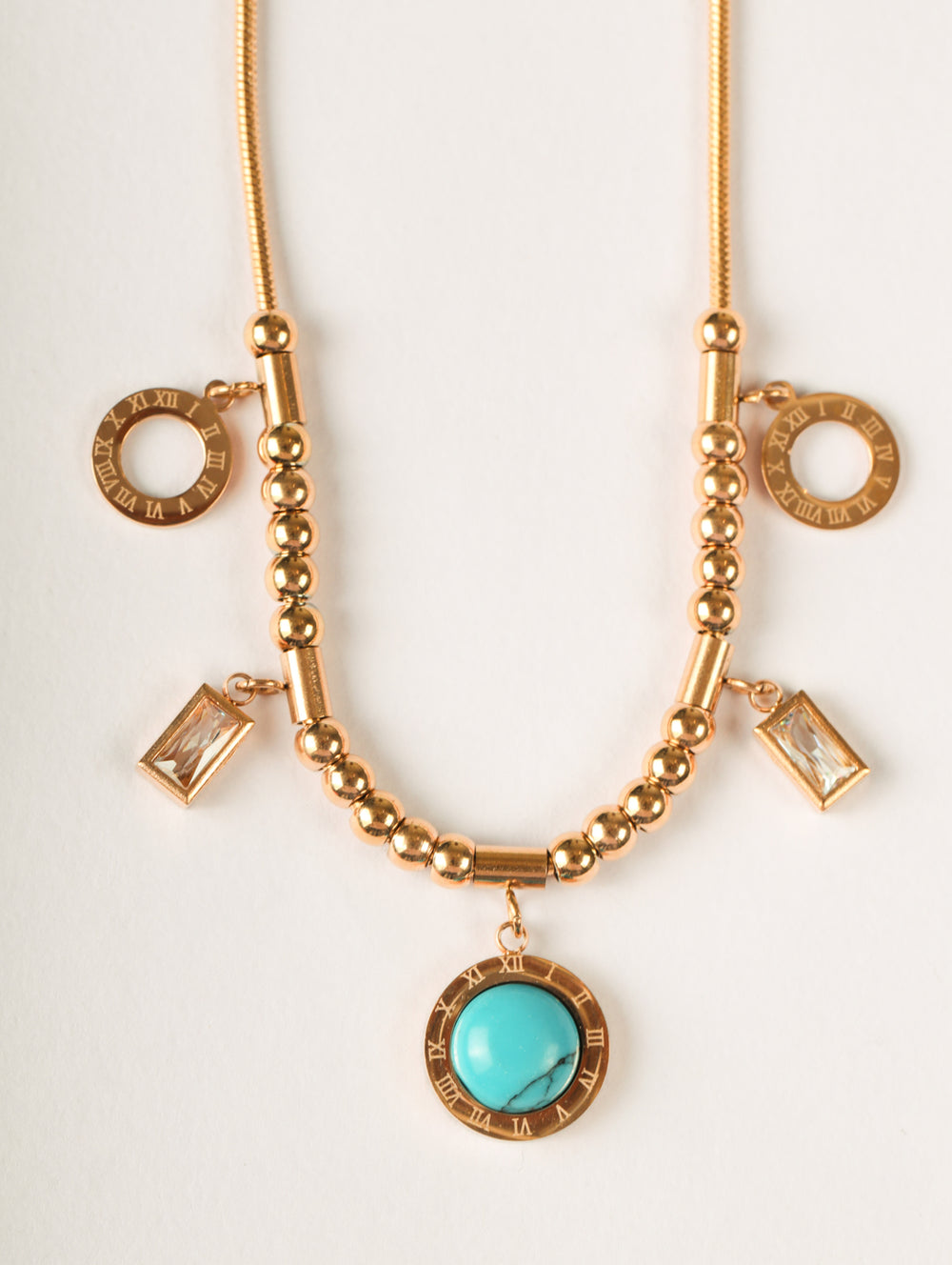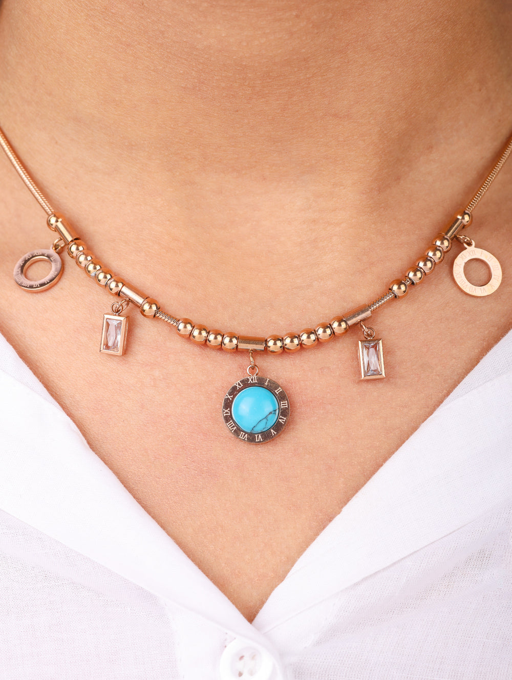 Bold, versatile, and trend-forward – the Roman Charm Choker Necklace 💫✨ is designed to elevate your everyday style. Featuring a snake chain adorned with polished beads, Roman numeral circle charms, rectangular crystal drops, and a striking turquoise stone centerpiece, this necklace blends vintage-inspired detailing with a modern edge. Perfect for layering or making a statement on its own.
