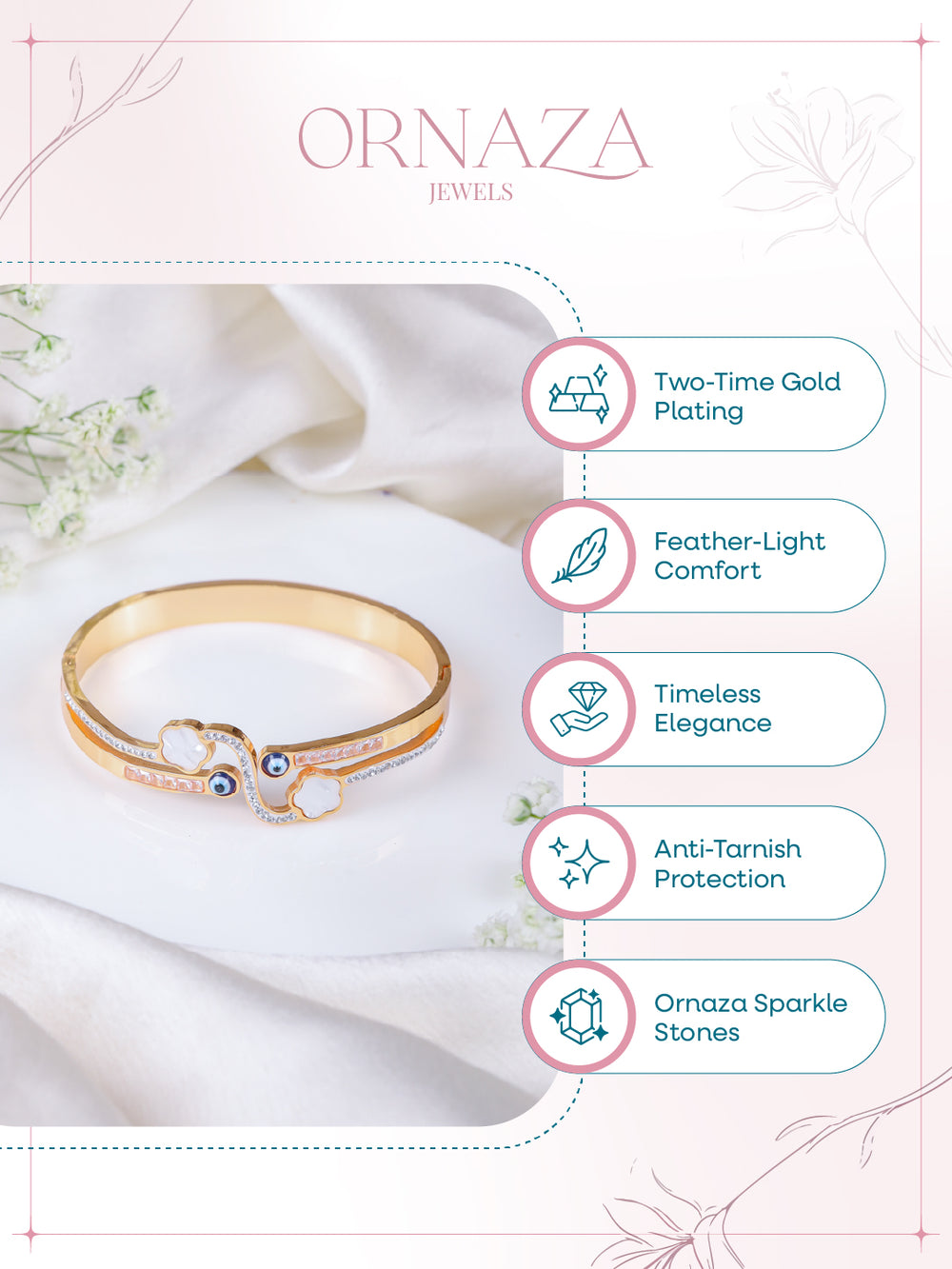 | Specification: | Dual-band rose gold bracelet with floral CZ & evil-eye motifs |