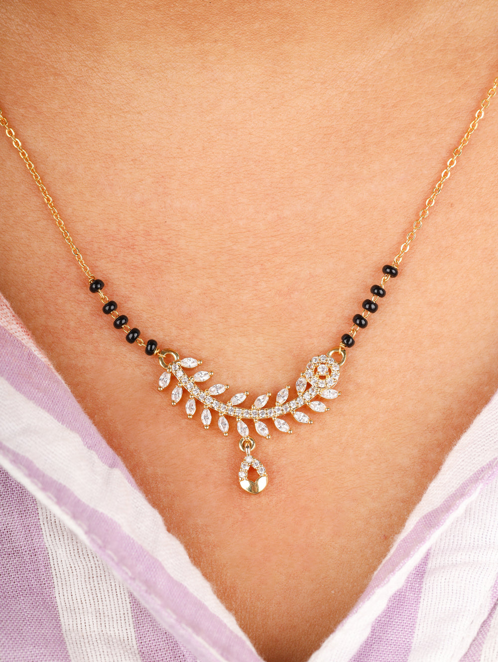 An opulent design featuring a floral-inspired pendant with cascading CZ-studded leaves 💎 and a delicate teardrop drop. Crafted in gold plating with black beads, this piece exudes luxury and elegance, making it perfect for weddings and grand occasions ❤️.
