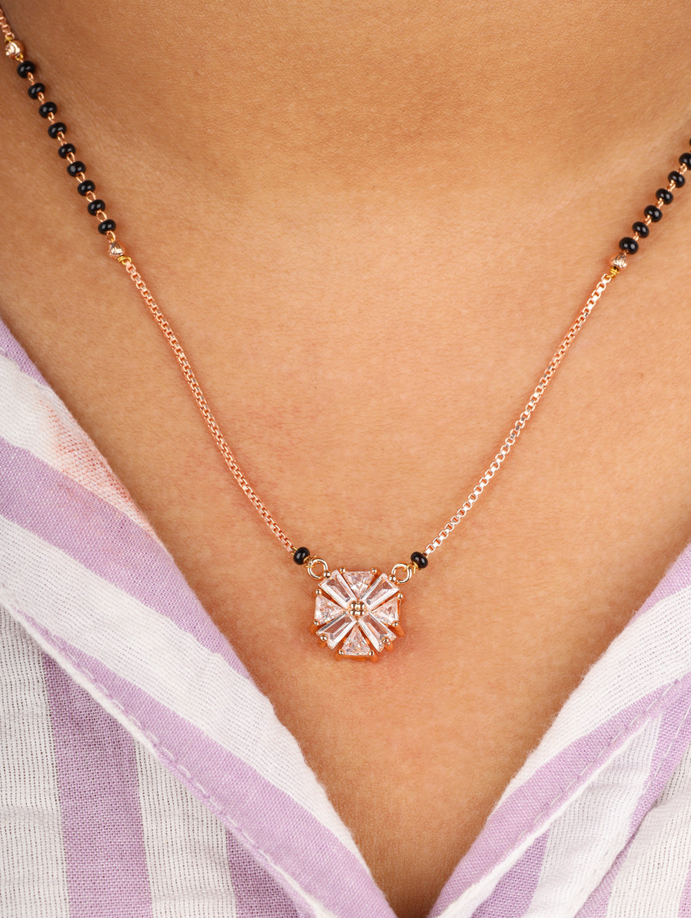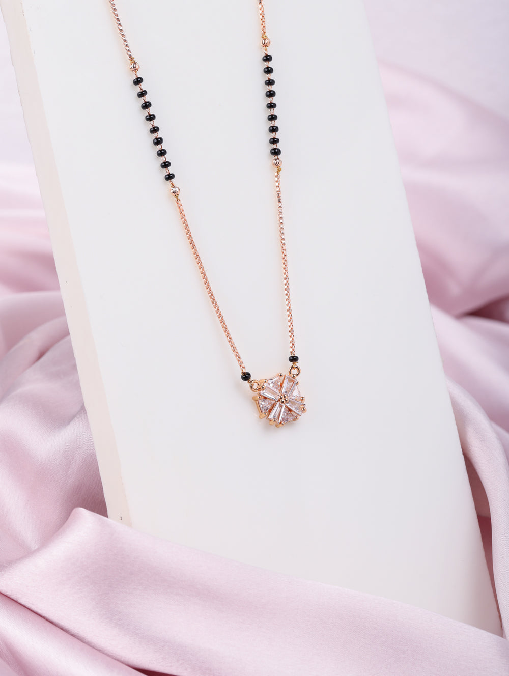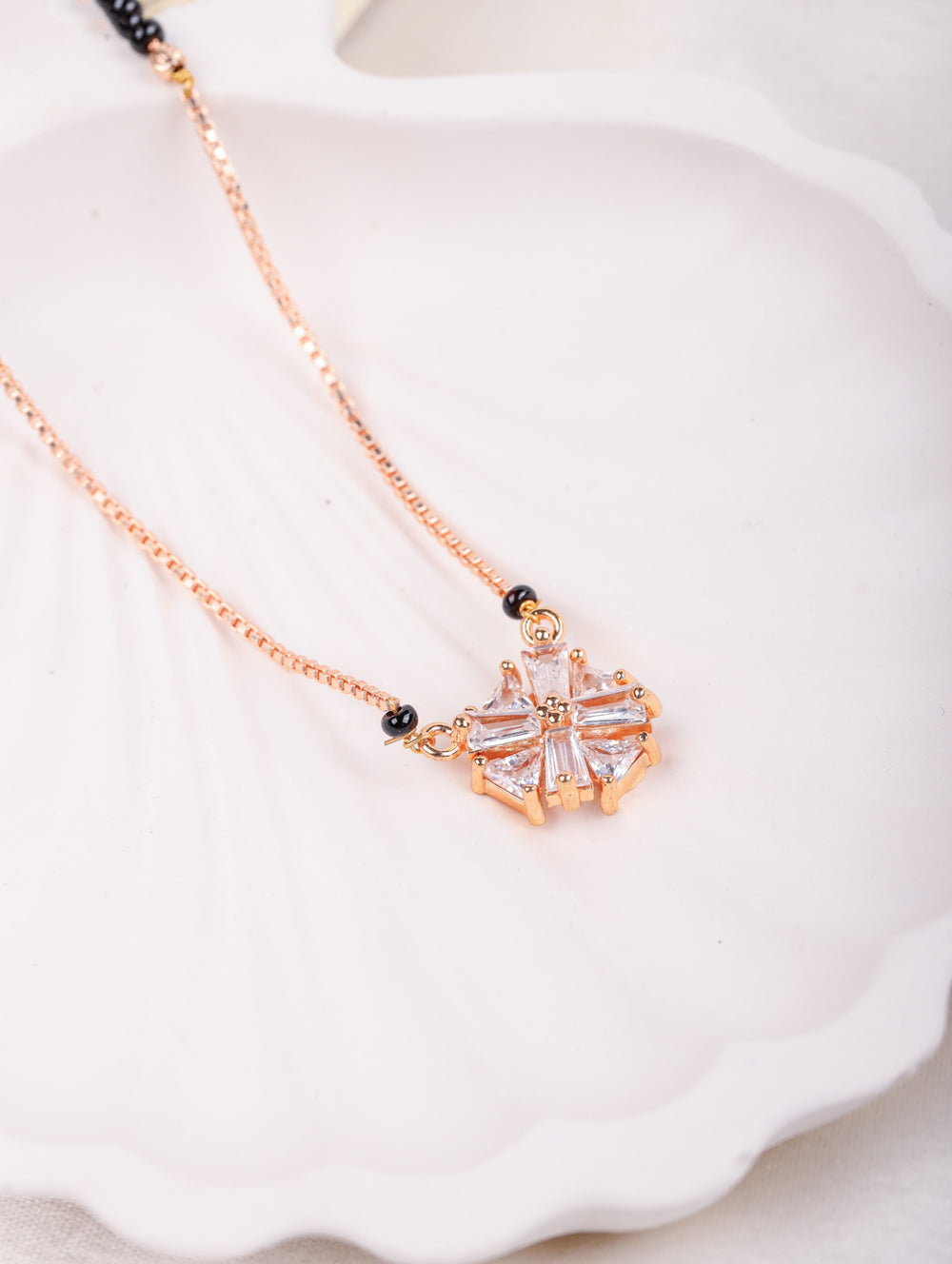 A radiant starburst-inspired pendant crafted with baguette-cut CZ stones 💎 in a rose-gold finish. Paired with a sleek black-bead chain, this design captures light and elegance, making it a perfect statement of modern tradition ❤️.