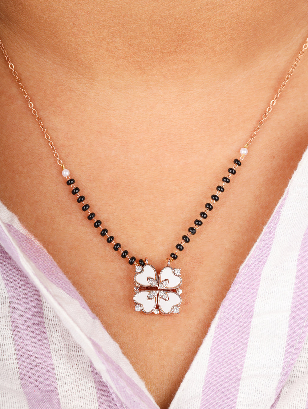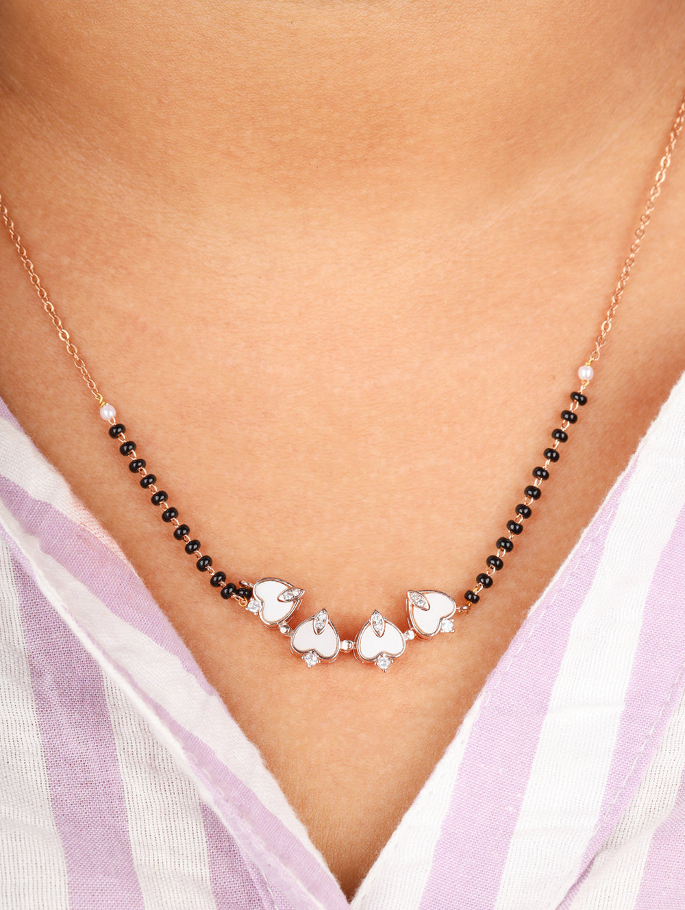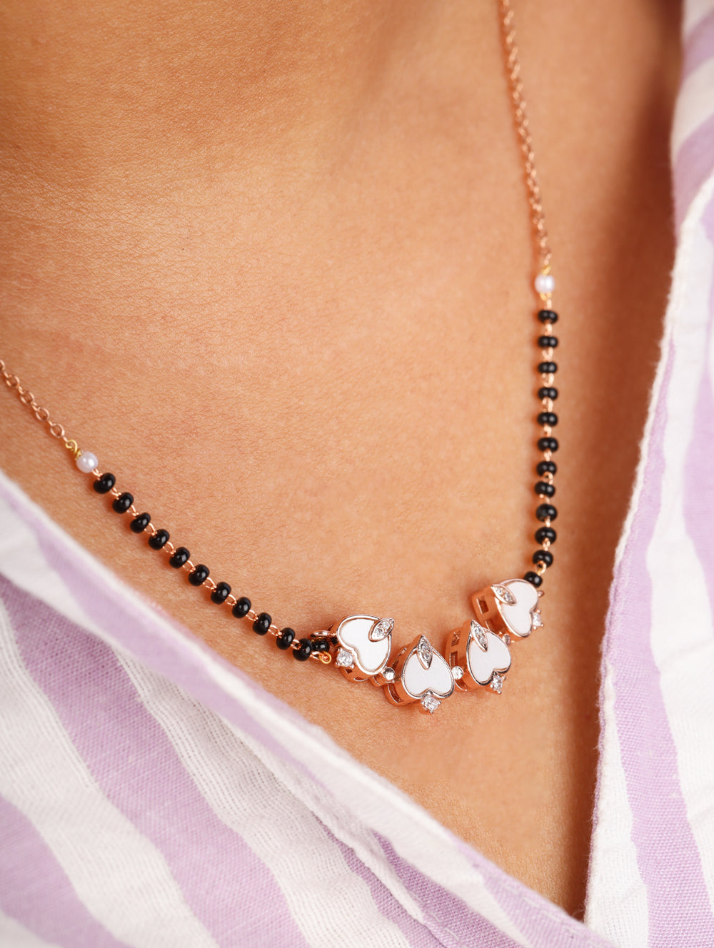 A graceful design featuring four pristine white enamel hearts 🤍 with CZ accents, symbolizing purity and everlasting love. Set in rose-gold plating with black beads, this mangalsutra beautifully balances elegance and modern charm ❤️.
