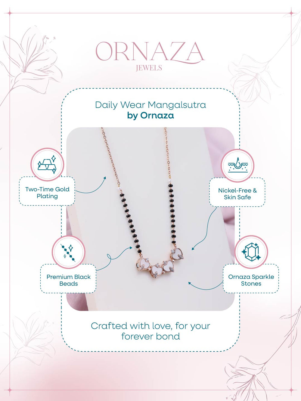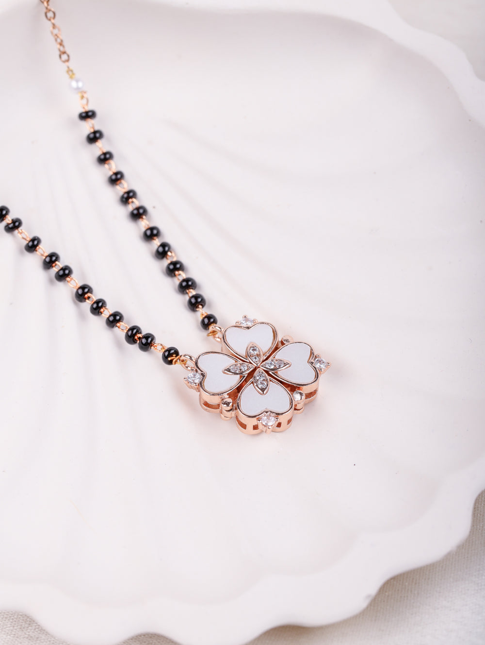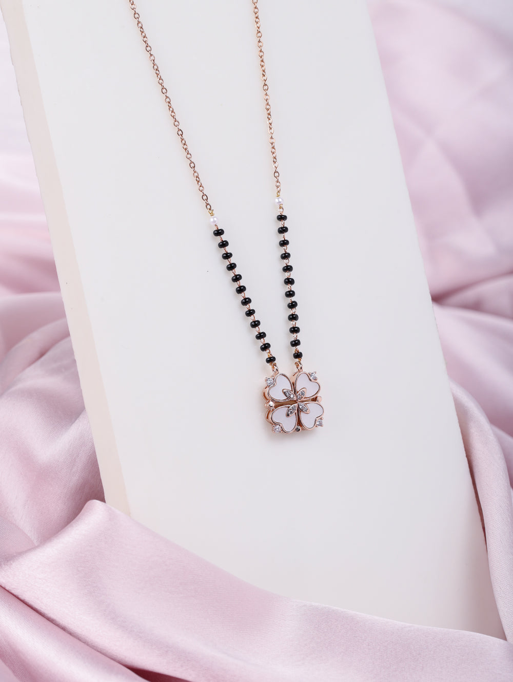 A graceful design featuring four pristine white enamel hearts 🤍 with CZ accents, symbolizing purity and everlasting love. Set in rose-gold plating with black beads, this mangalsutra beautifully balances elegance and modern charm ❤️.